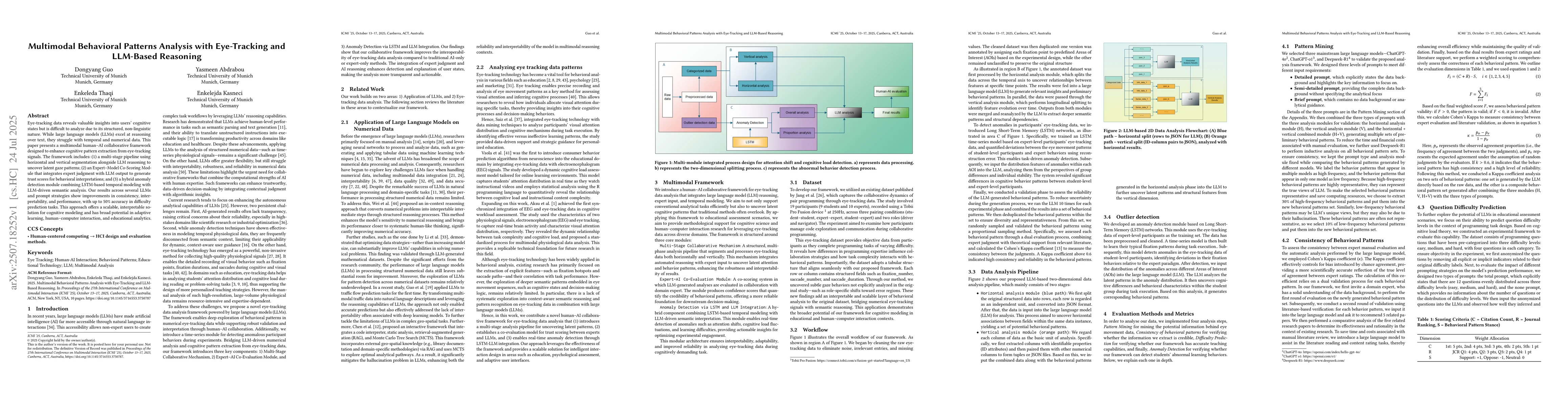 Eye-tracking data reveals valuable insights into users' cognitive states but is difficult to analyze due to its structured, non-linguistic nature. While large language models (LLMs) excel at reasoning over text, they struggle with temporal and numerical data. This paper presents a multimodal human-AI collaborative framework designed to enhance cognitive pattern extraction from eye-tracking signals. The framework includes: (1) a multi-stage pipeline using horizontal and vertical segmentation alongside LLM reasoning to uncover latent gaze patterns; (2) an Expert-Model Co-Scoring Module that integrates expert judgment with LLM output to generate trust scores for behavioral interpretations; and (3) a hybrid anomaly detection module combining LSTM-based temporal modeling with LLM-driven semantic analysis. Our results across several LLMs and prompt strategies show improvements in consistency, interpretability, and performance, with up to 50% accuracy in difficulty prediction tasks. This approach offers a scalable, interpretable solution for cognitive modeling and has broad potential in adaptive learning, human-computer interaction, and educational analytics.