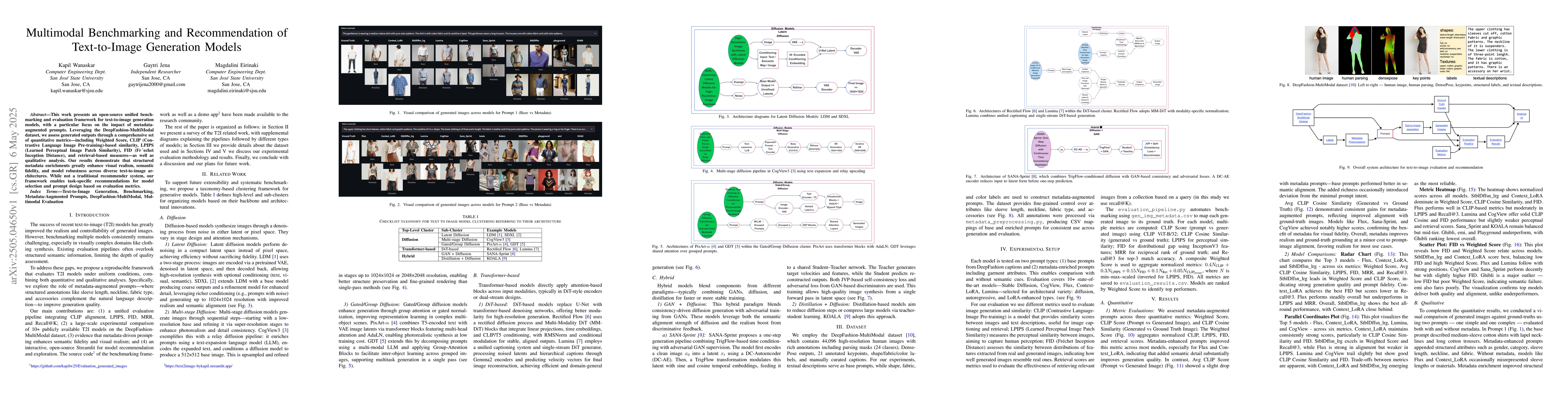 This work presents an open-source unified benchmarking and evaluation framework for text-to-image generation models, with a particular focus on the impact of metadata augmented prompts. Leveraging the DeepFashion-MultiModal dataset, we assess generated outputs through a comprehensive set of quantitative metrics, including Weighted Score, CLIP (Contrastive Language Image Pre-training)-based similarity, LPIPS (Learned Perceptual Image Patch Similarity), FID (Frechet Inception Distance), and retrieval-based measures, as well as qualitative analysis. Our results demonstrate that structured metadata enrichments greatly enhance visual realism, semantic fidelity, and model robustness across diverse text-to-image architectures. While not a traditional recommender system, our framework enables task-specific recommendations for model selection and prompt design based on evaluation metrics.