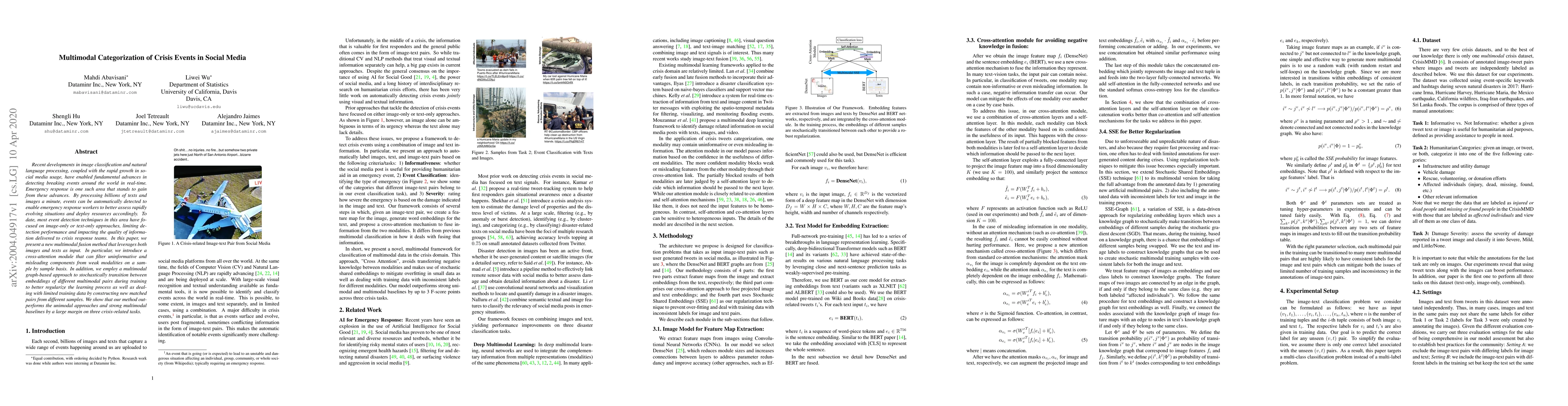 The paper presents a multimodal fusion method for categorizing crisis events using both images and texts, introducing a cross-attention module to filter uninformative components and a multimodal graph-based approach for regularizing the learning process with limited training data.
