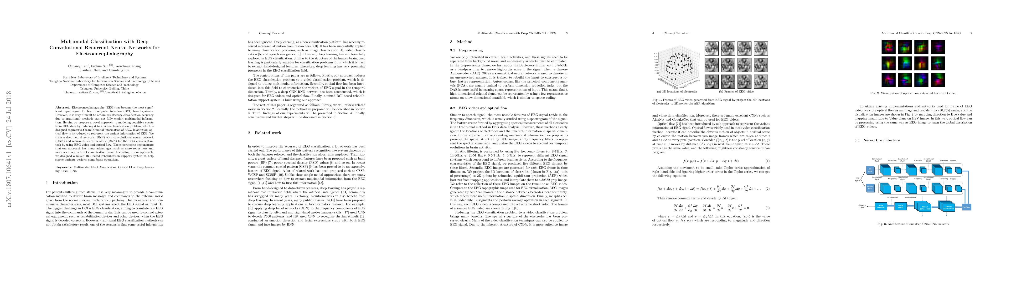 Electroencephalography (EEG) has become the most significant input signal for brain computer interface (BCI) based systems. However, it is very difficult to obtain satisfactory classification accuracy due to traditional methods can not fully exploit multimodal information. Herein, we propose a novel approach to modeling cognitive events from EEG data by reducing it to a video classification problem, which is designed to preserve the multimodal information of EEG. In addition, optical flow is introduced to represent the variant information of EEG. We train a deep neural network (DNN) with convolutional neural network (CNN) and recurrent neural network (RNN) for the EEG classification task by using EEG video and optical flow. The experiments demonstrate that our approach has many advantages, such as more robustness and more accuracy in EEG classification tasks. According to our approach, we designed a mixed BCI-based rehabilitation support system to help stroke patients perform some basic operations.