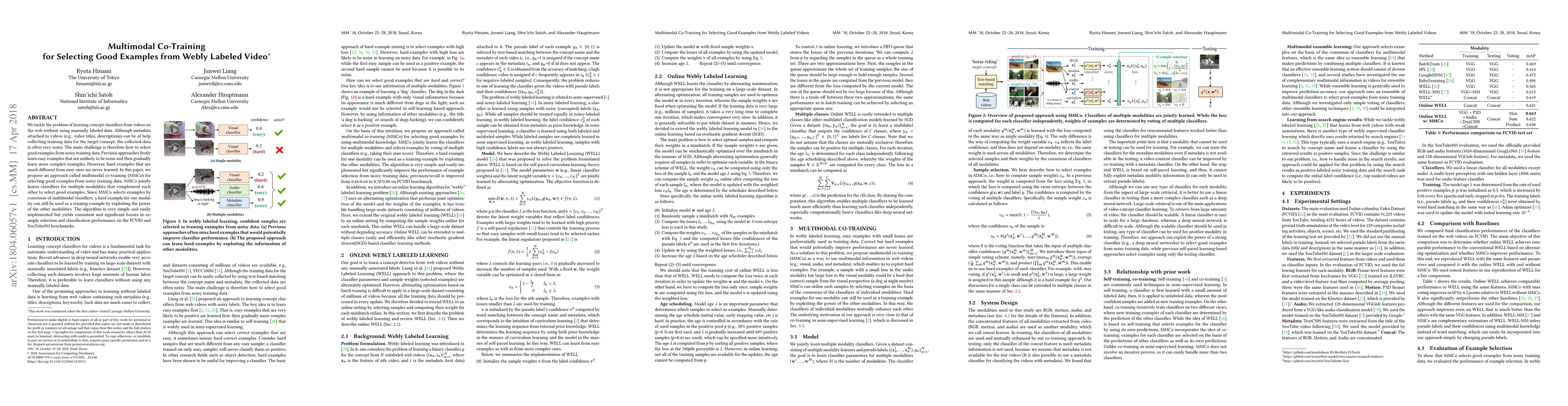 We tackle the problem of learning concept classifiers from videos on the web without using manually labeled data. Although metadata attached to videos (e.g., video titles, descriptions) can be of help collecting training data for the target concept, the collected data is often very noisy. The main challenge is therefore how to select good examples from noisy training data. Previous approaches firstly learn easy examples that are unlikely to be noise and then gradually learn more complex examples. However, hard examples that are much different from easy ones are never learned. In this paper, we propose an approach called multimodal co-training (MMCo) for selecting good examples from noisy training data. MMCo jointly learns classifiers for multiple modalities that complement each other to select good examples. Since MMCo selects examples by consensus of multimodal classifiers, a hard example for one modality can still be used as a training example by exploiting the power of the other modalities. The algorithm is very simple and easily implemented but yields consistent and significant boosts in example selection and classification performance on the FCVID and YouTube8M benchmarks.