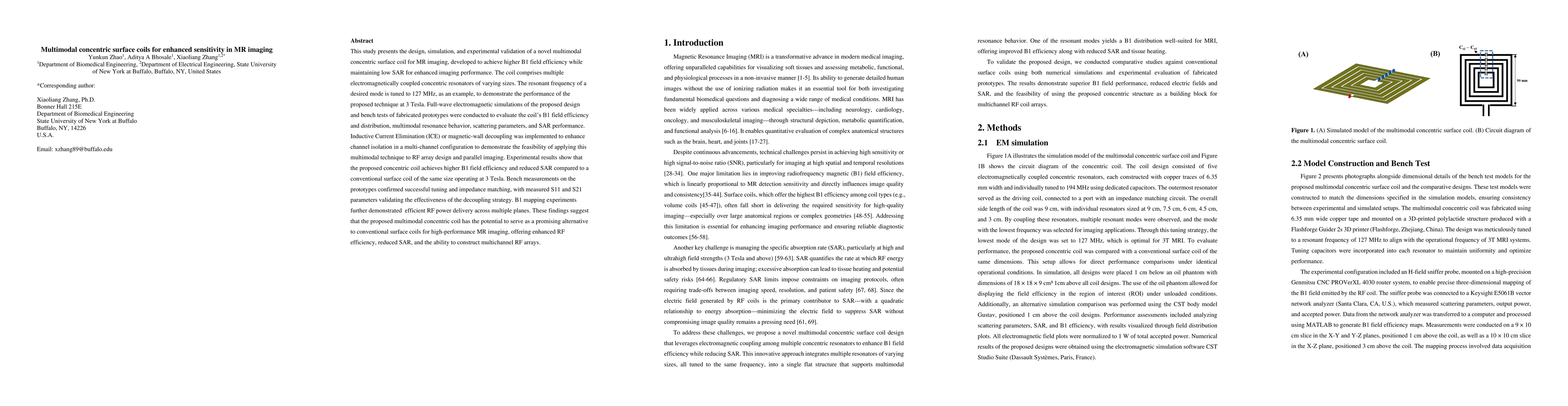 The study presents the design, simulation, and experimental validation of a novel multimodal concentric surface coil for MR imaging, focusing on enhancing B1 field efficiency and minimizing SAR.