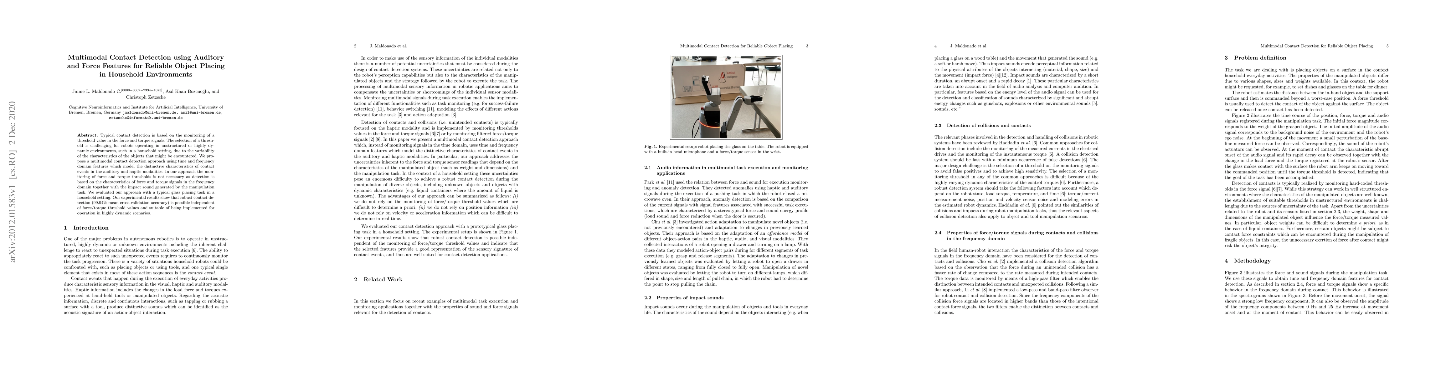 This research introduces a multimodal contact detection method using auditory and force features, eliminating the need for force/torque threshold monitoring. The approach, tested in a household setting, achieved highly accurate contact detection (99.94% mean cross-validation accuracy), demonstrating reliability in dynamic environments.