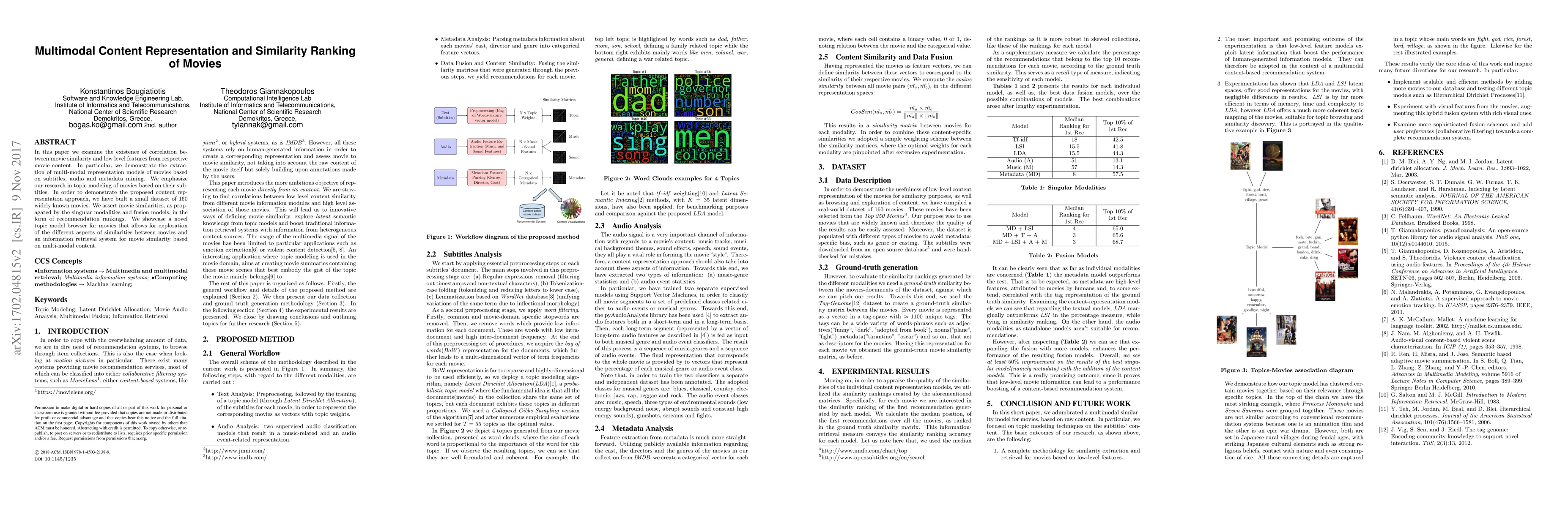This paper explores correlations between movie similarity and low-level features extracted from subtitles, audio, and metadata. It introduces a multimodal representation model for movies, emphasizing topic modeling from subtitles, and demonstrates a novel topic model browser and recommendation system for movie similarity based on multi-modal content.