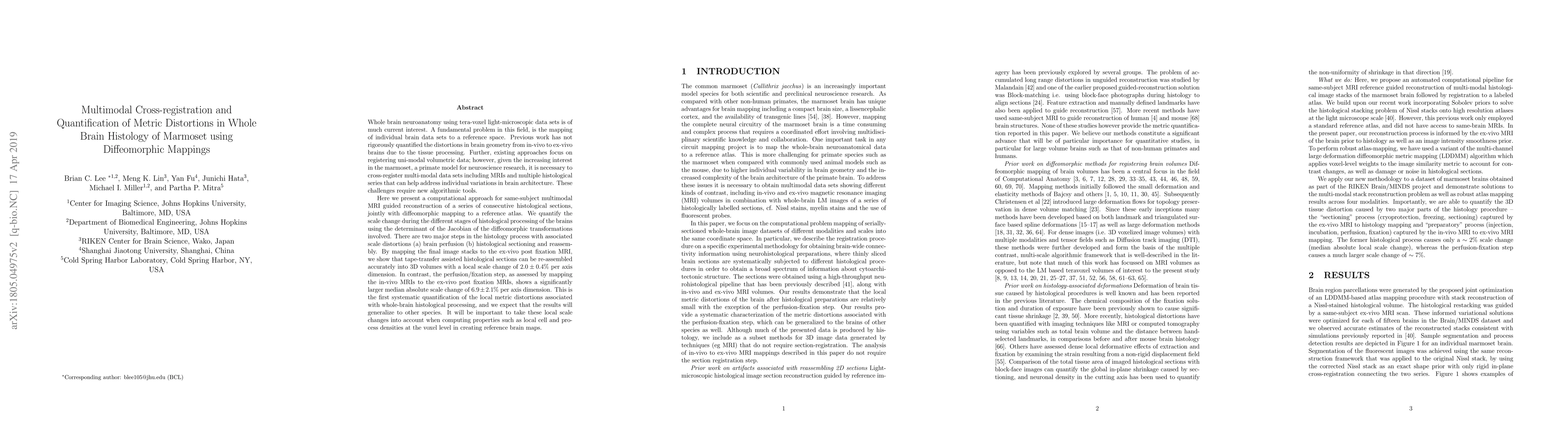 This paper presents a computational method for multimodal cross-registration of MRI and histological data in marmoset brains, using diffeomorphic mappings to quantify metric distortions during histological processing. It identifies significant scale changes in perfusion and sectioning stages, with perfusion causing a larger distortion of 6.9% per axis compared to sectioning's 2.0% per axis.