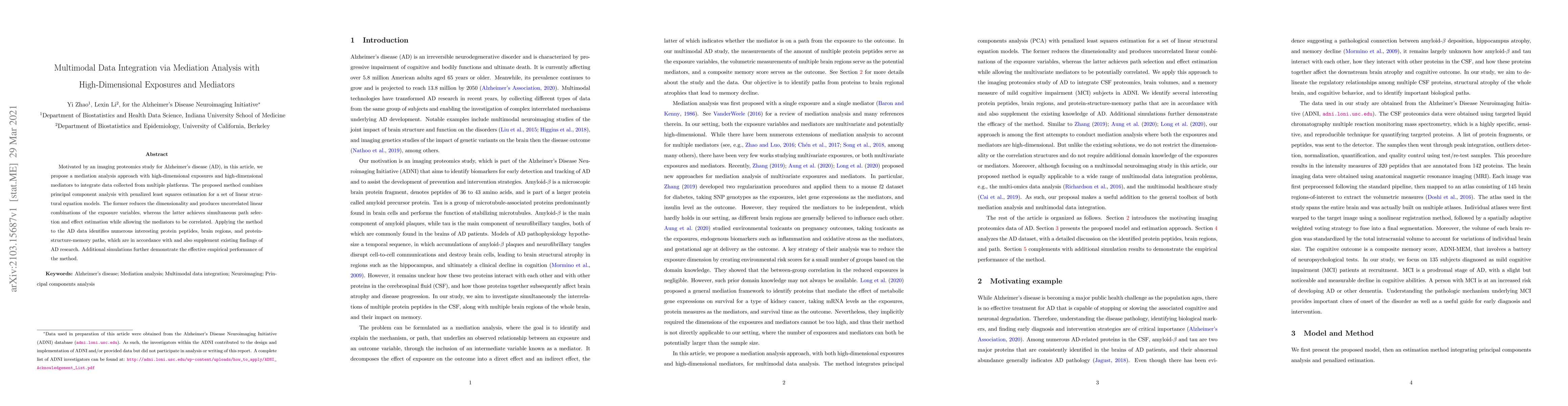 This paper proposes a mediation analysis approach combining principal component analysis with penalized least squares to integrate multimodal data from imaging and proteomics studies for Alzheimer's disease. The method identifies significant protein peptides, brain regions, and pathways, complementing existing research findings.