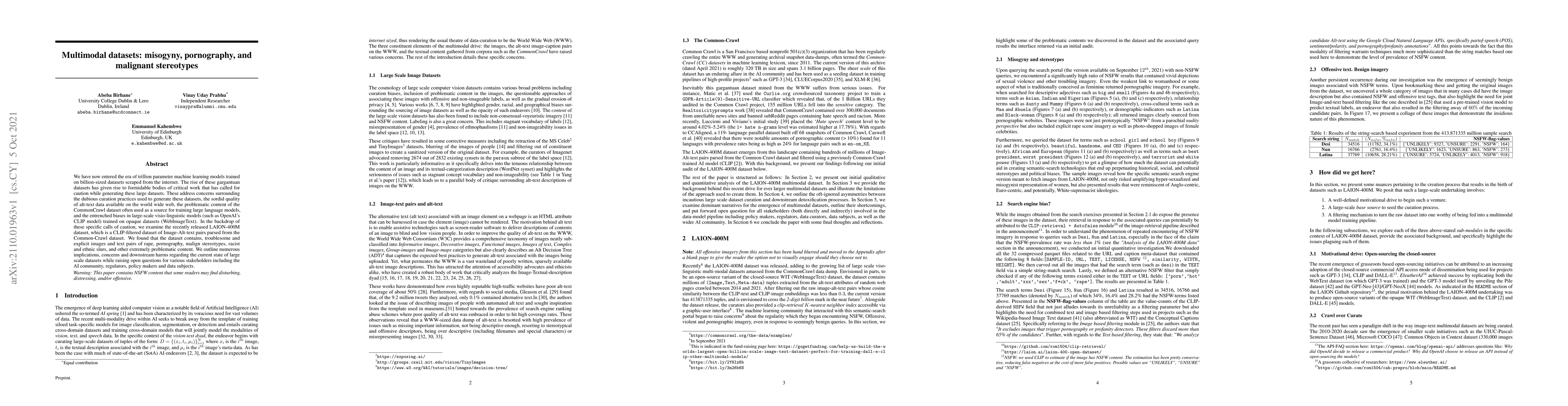 The paper presents a detailed examination of the LAION-400M dataset, revealing its problematic content and questioning the current practices in dataset curation and release.