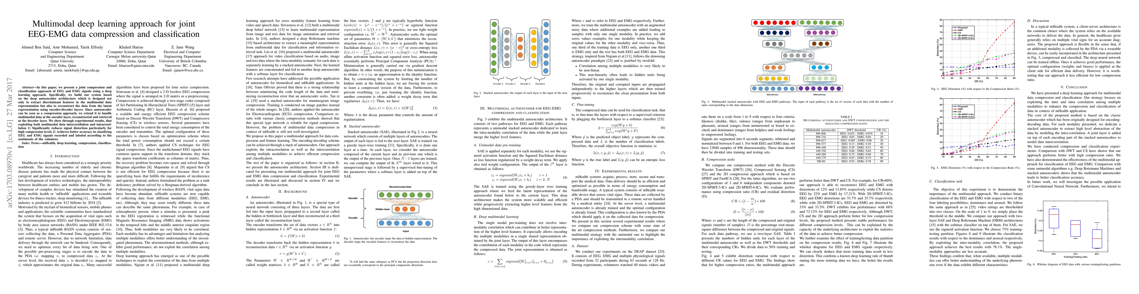 In this paper, we present a joint compression and classification approach of EEG and EMG signals using a deep learning approach. Specifically, we build our system based on the deep autoencoder architecture which is designed not only to extract discriminant features in the multimodal data representation but also to reconstruct the data from the latent representation using encoder-decoder layers. Since autoencoder can be seen as a compression approach, we extend it to handle multimodal data at the encoder layer, reconstructed and retrieved at the decoder layer. We show through experimental results, that exploiting both multimodal data intercorellation and intracorellation 1) Significantly reduces signal distortion particularly for high compression levels 2) Achieves better accuracy in classifying EEG and EMG signals recorded and labeled according to the sentiments of the volunteer.