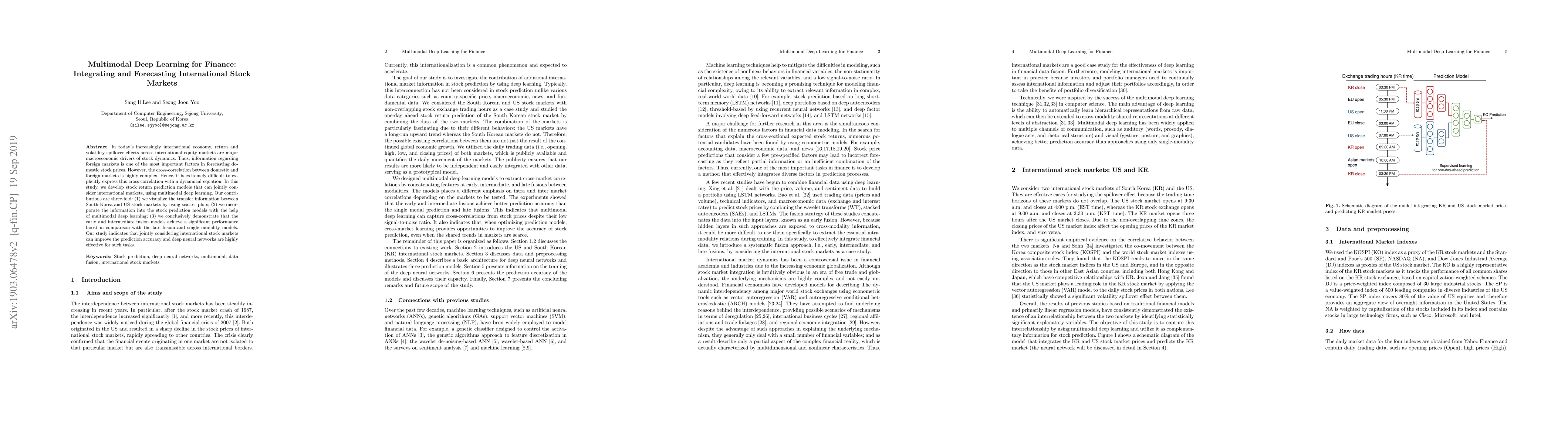 In today's increasingly international economy, return and volatility spillover effects across international equity markets are major macroeconomic drivers of stock dynamics. Thus, information regarding foreign markets is one of the most important factors in forecasting domestic stock prices. However, the cross-correlation between domestic and foreign markets is highly complex. Hence, it is extremely difficult to explicitly express this cross-correlation with a dynamical equation. In this study, we develop stock return prediction models that can jointly consider international markets, using multimodal deep learning. Our contributions are three-fold: (1) we visualize the transfer information between South Korea and US stock markets by using scatter plots; (2) we incorporate the information into the stock prediction models with the help of multimodal deep learning; (3) we conclusively demonstrate that the early and intermediate fusion models achieve a significant performance boost in comparison with the late fusion and single modality models. Our study indicates that jointly considering international stock markets can improve the prediction accuracy and deep neural networks are highly effective for such tasks.
