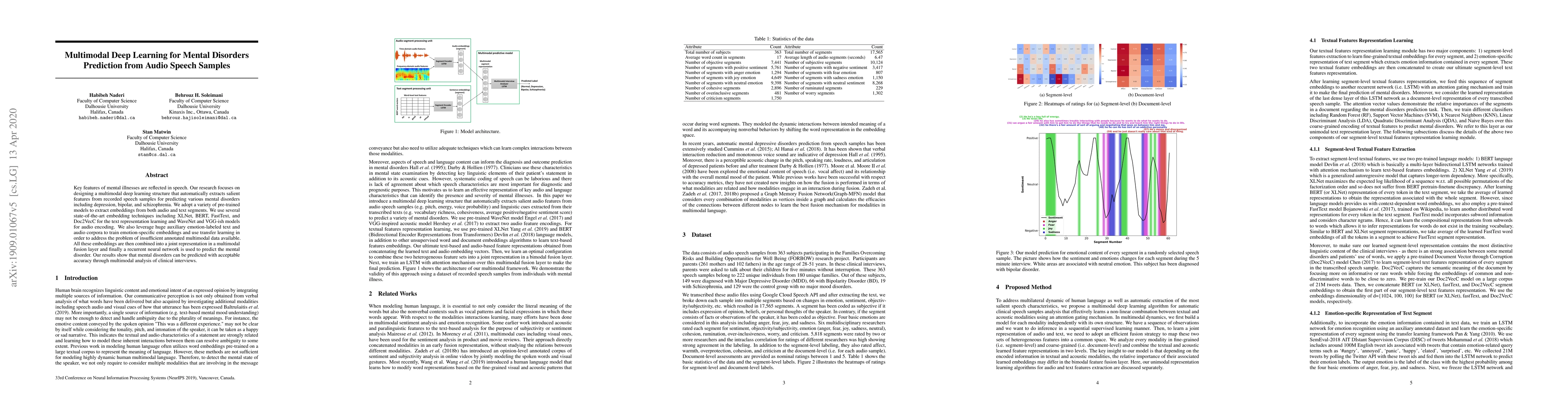 Key features of mental illnesses are reflected in speech. Our research focuses on designing a multimodal deep learning structure that automatically extracts salient features from recorded speech samples for predicting various mental disorders including depression, bipolar, and schizophrenia. We adopt a variety of pre-trained models to extract embeddings from both audio and text segments. We use several state-of-the-art embedding techniques including BERT, FastText, and Doc2VecC for the text representation learning and WaveNet and VGG-ish models for audio encoding. We also leverage huge auxiliary emotion-labeled text and audio corpora to train emotion-specific embeddings and use transfer learning in order to address the problem of insufficient annotated multimodal data available. All these embeddings are then combined into a joint representation in a multimodal fusion layer and finally a recurrent neural network is used to predict the mental disorder. Our results show that mental disorders can be predicted with acceptable accuracy through multimodal analysis of clinical interviews.