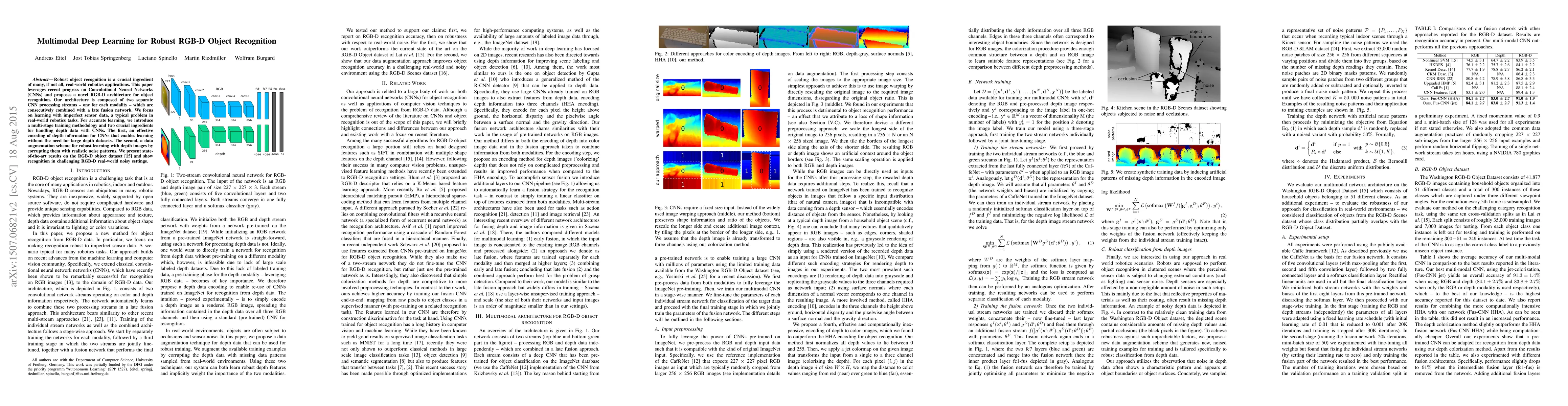 This paper proposes a multimodal deep learning architecture for robust RGB-D object recognition using separate CNN streams for RGB and depth data, combined with late fusion. It introduces innovative methods for encoding depth information and augmenting depth images to handle imperfect sensor data, achieving state-of-the-art results in challenging real-world scenarios.