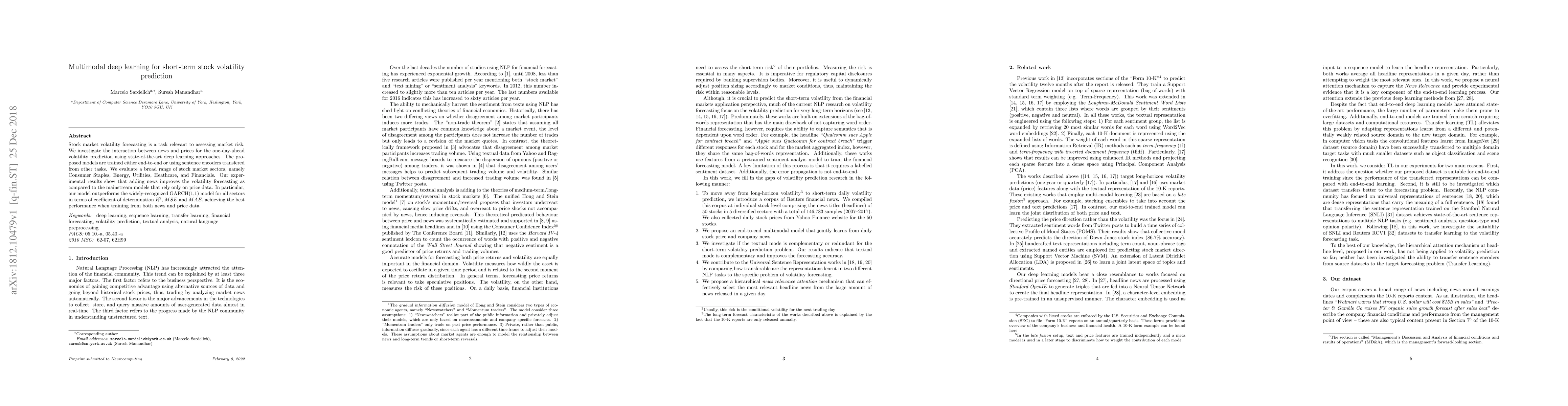 This paper explores multimodal deep learning for predicting one-day-ahead stock market volatility by integrating news data with price data. The model outperforms traditional GARCH(1,1) in forecasting across various sectors, demonstrating that news enhances volatility prediction.