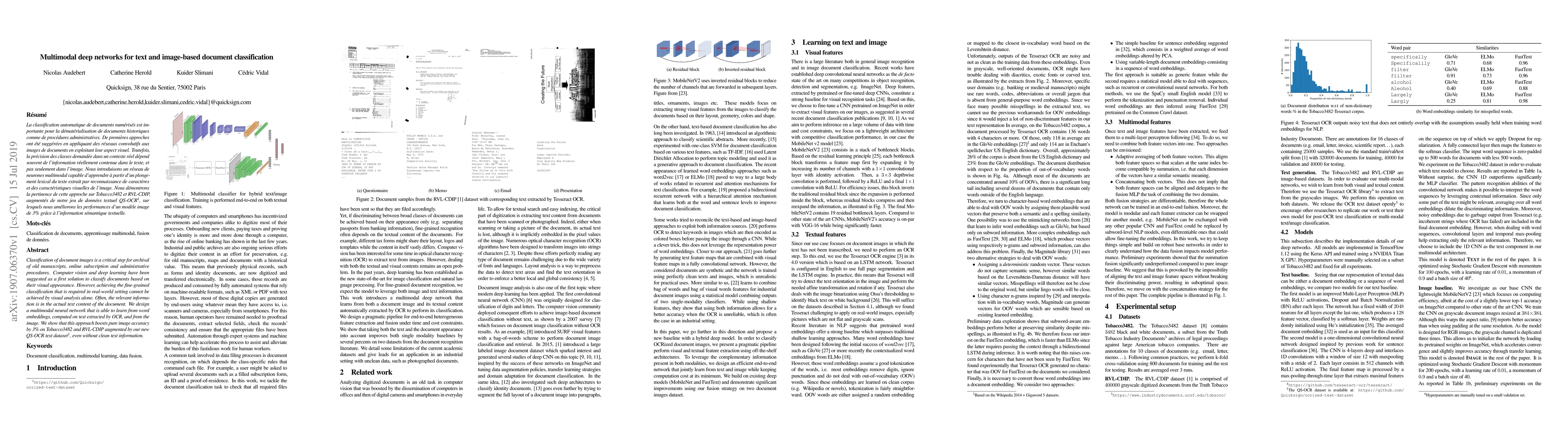 Classification of document images is a critical step for archival of old manuscripts, online subscription and administrative procedures. Computer vision and deep learning have been suggested as a first solution to classify documents based on their visual appearance. However, achieving the fine-grained classification that is required in real-world setting cannot be achieved by visual analysis alone. Often, the relevant information is in the actual text content of the document. We design a multimodal neural network that is able to learn from word embeddings, computed on text extracted by OCR, and from the image. We show that this approach boosts pure image accuracy by 3% on Tobacco3482 and RVL-CDIP augmented by our new QS-OCR text dataset (https://github.com/Quicksign/ocrized-text-dataset), even without clean text information.