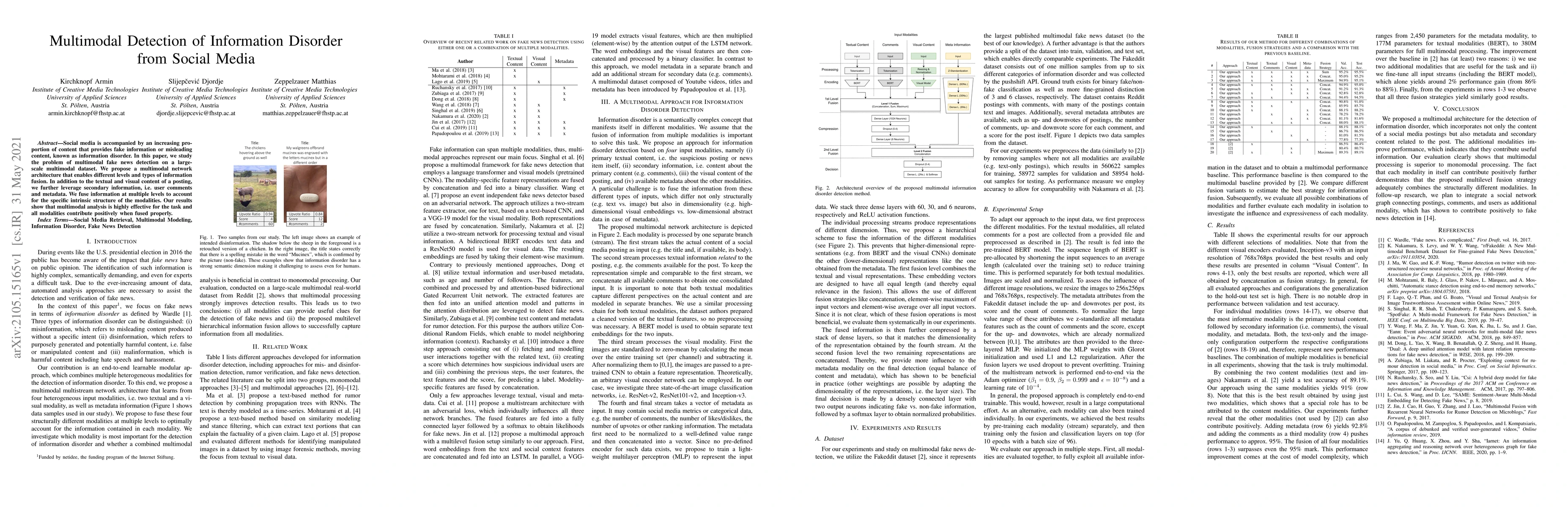 Social media is accompanied by an increasing proportion of content that provides fake information or misleading content, known as information disorder. In this paper, we study the problem of multimodal fake news detection on a largescale multimodal dataset. We propose a multimodal network architecture that enables different levels and types of information fusion. In addition to the textual and visual content of a posting, we further leverage secondary information, i.e. user comments and metadata. We fuse information at multiple levels to account for the specific intrinsic structure of the modalities. Our results show that multimodal analysis is highly effective for the task and all modalities contribute positively when fused properly.