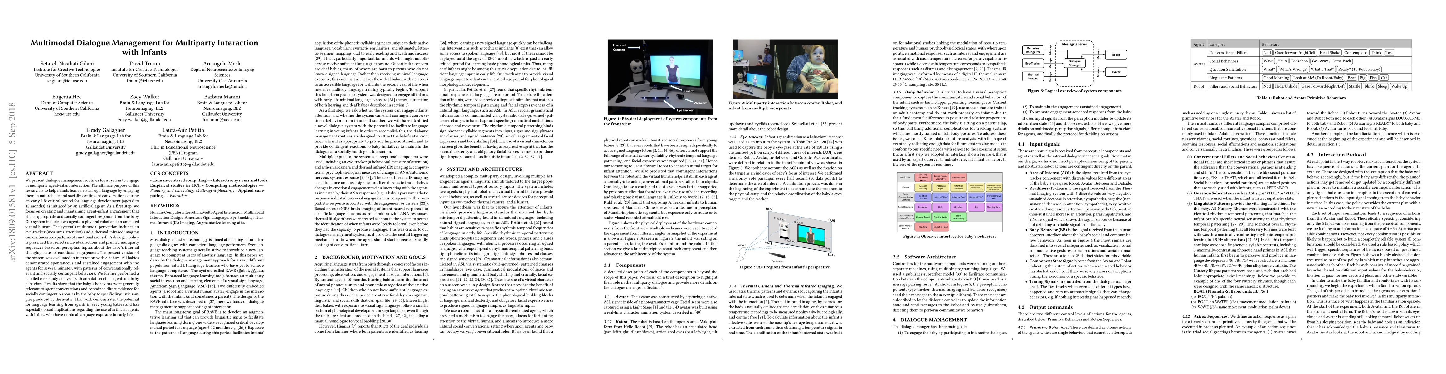 This research develops multimodal dialogue management for multiparty interactions between infants and artificial agents, aiming to facilitate visual sign language learning. The system, featuring a robot and a virtual human, uses eye-tracking and thermal imaging to gauge emotional engagement, and was successfully tested with 8 infants, showing sustained engagement and socially contingent responses.