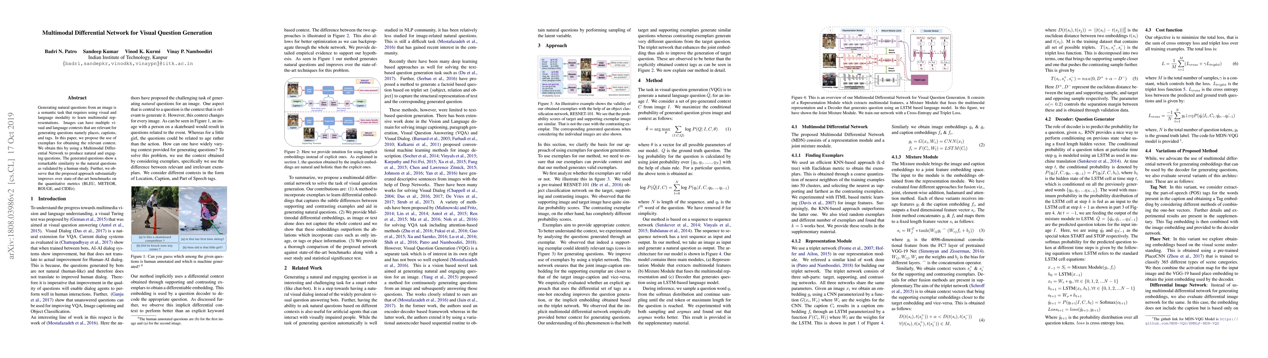 This paper introduces a Multimodal Differential Network to generate natural questions from images using visual and language modalities. The method employs exemplars to capture relevant contexts like places, captions, and tags. Results show generated questions are similar to human-written ones and significantly outperform existing methods on benchmarks (BLEU, METEOR, ROUGE, CIDEr).