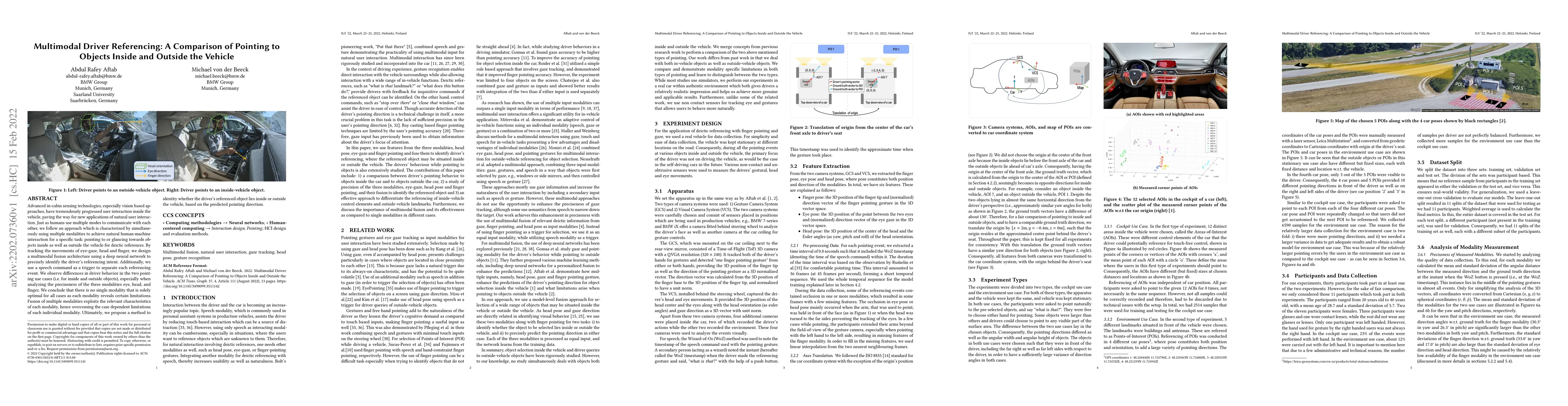 This study explores multimodal driver referencing using eye-gaze, head, and finger movements, combined with speech commands, to identify driver intent for pointing to objects inside and outside the vehicle. The research finds that no single modality is optimal for all scenarios, but fusing multiple modalities enhances accuracy by leveraging each modality's strengths.