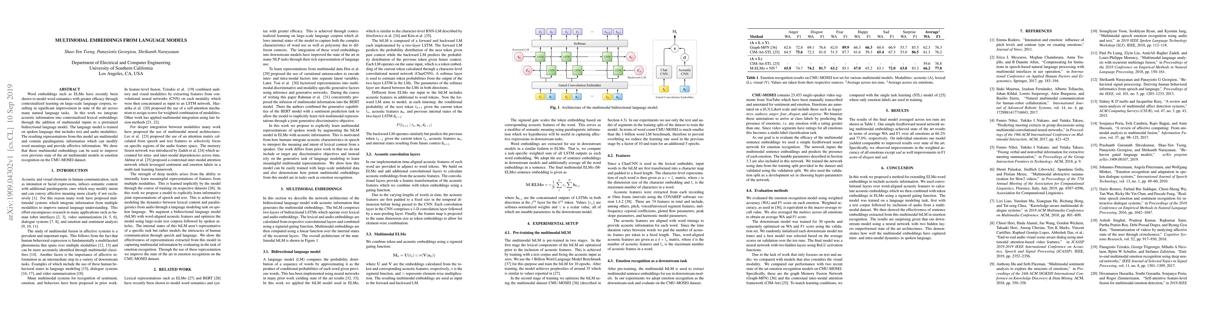 Word embeddings such as ELMo have recently been shown to model word semantics with greater efficacy through contextualized learning on large-scale language corpora, resulting in significant improvement in state of the art across many natural language tasks. In this work we integrate acoustic information into contextualized lexical embeddings through the addition of multimodal inputs to a pretrained bidirectional language model. The language model is trained on spoken language that includes text and audio modalities. The resulting representations from this model are multimodal and contain paralinguistic information which can modify word meanings and provide affective information. We show that these multimodal embeddings can be used to improve over previous state of the art multimodal models in emotion recognition on the CMU-MOSEI dataset.