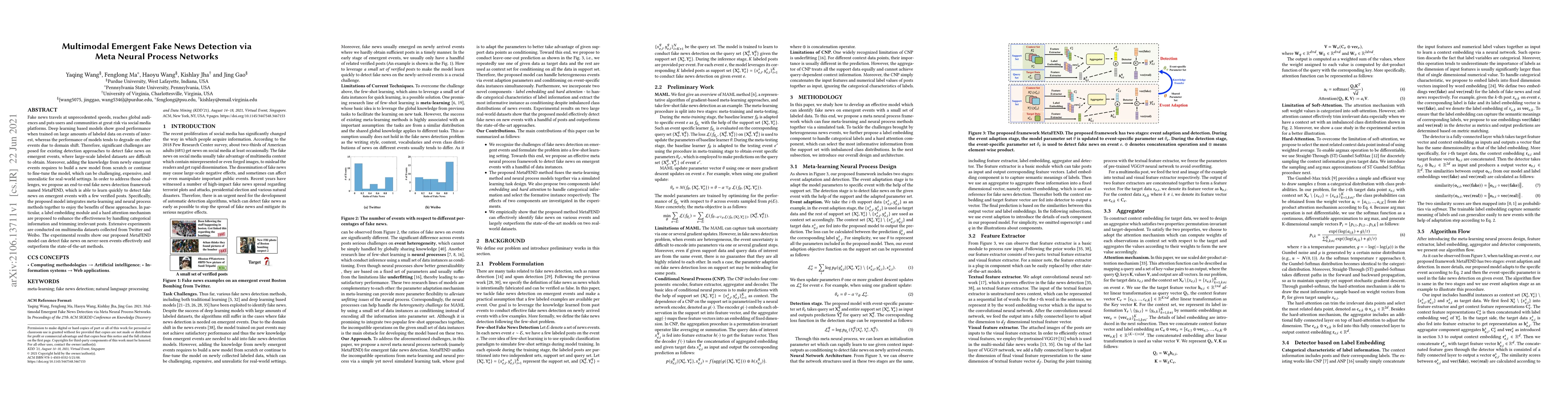 The paper proposes MetaFEND, a multimodal fake news detection framework using meta-learning and neural processes to quickly adapt to emergent events with limited labeled data. The model incorporates label embedding and attention mechanisms to enhance detection effectiveness, outperforming existing methods on Twitter and Weibo datasets.