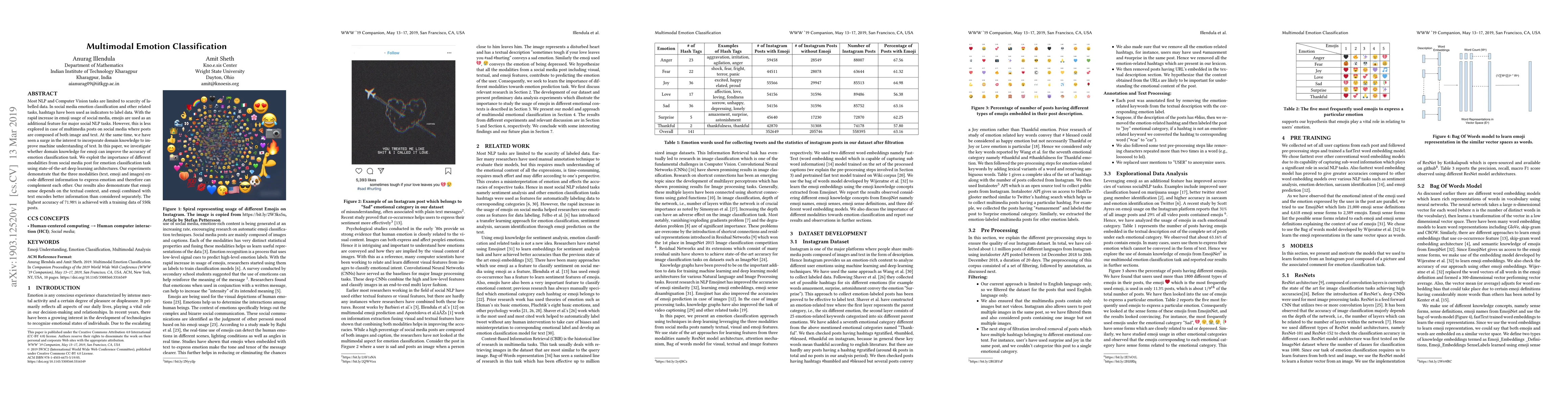 Most NLP and Computer Vision tasks are limited to scarcity of labelled data. In social media emotion classification and other related tasks, hashtags have been used as indicators to label data. With the rapid increase in emoji usage of social media, emojis are used as an additional feature for major social NLP tasks. However, this is less explored in case of multimedia posts on social media where posts are composed of both image and text. At the same time, w.e have seen a surge in the interest to incorporate domain knowledge to improve machine understanding of text. In this paper, we investigate whether domain knowledge for emoji can improve the accuracy of emotion classification task. We exploit the importance of different modalities from social media post for emotion classification task using state-of-the-art deep learning architectures. Our experiments demonstrate that the three modalities (text, emoji and images) encode different information to express emotion and therefore can complement each other. Our results also demonstrate that emoji sense depends on the textual context, and emoji combined with text encodes better information than considered separately. The highest accuracy of 71.98\% is achieved with a training data of 550k posts.