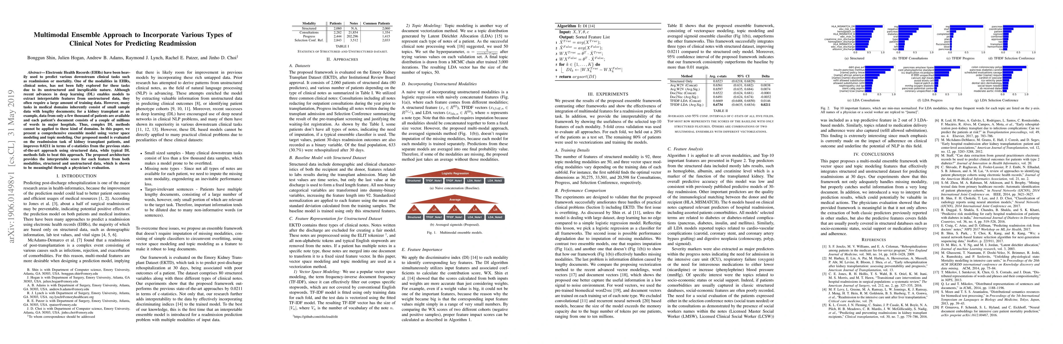 Electronic Health Records (EHRs) have been heavily used to predict various downstream clinical tasks such as readmission or mortality. One of the modalities in EHRs, clinical notes, has not been fully explored for these tasks due to its unstructured and inexplicable nature. Although recent advances in deep learning (DL) enables models to extract interpretable features from unstructured data, they often require a large amount of training data. However, many tasks in medical domains inherently consist of small sample data with lengthy documents; for a kidney transplant as an example, data from only a few thousand of patients are available and each patient's document consists of a couple of millions of words in major hospitals. Thus, complex DL methods cannot be applied to these kinds of domains. In this paper, we present a comprehensive ensemble model using vector space modeling and topic modeling. Our proposed model is evaluated on the readmission task of kidney transplant patients and improves 0.0211 in terms of c-statistics from the previous state-of-the-art approach using structured data, while typical DL methods fail to beat this approach. The proposed architecture provides the interpretable score for each feature from both modalities, structured and unstructured data, which is shown to be meaningful through a physician's evaluation.