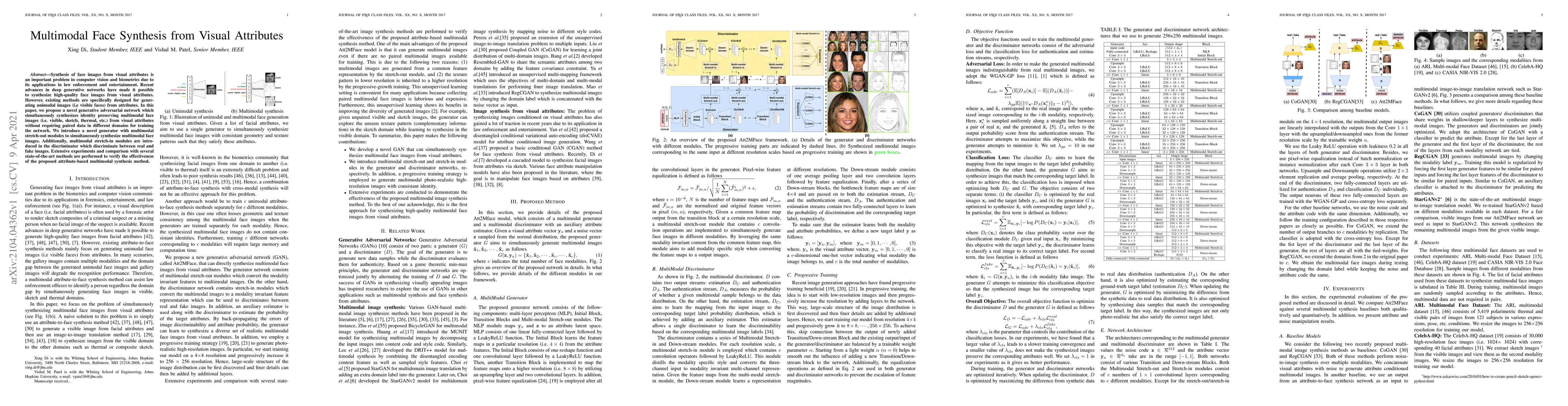 This paper proposes a novel generative adversarial network for synthesizing multimodal face images (visible, sketch, thermal, etc.) from visual attributes without paired data across domains. The method includes a generator with multimodal stretch-out modules and a discriminator with stretch-in modules, validated through extensive experiments against state-of-the-art techniques.