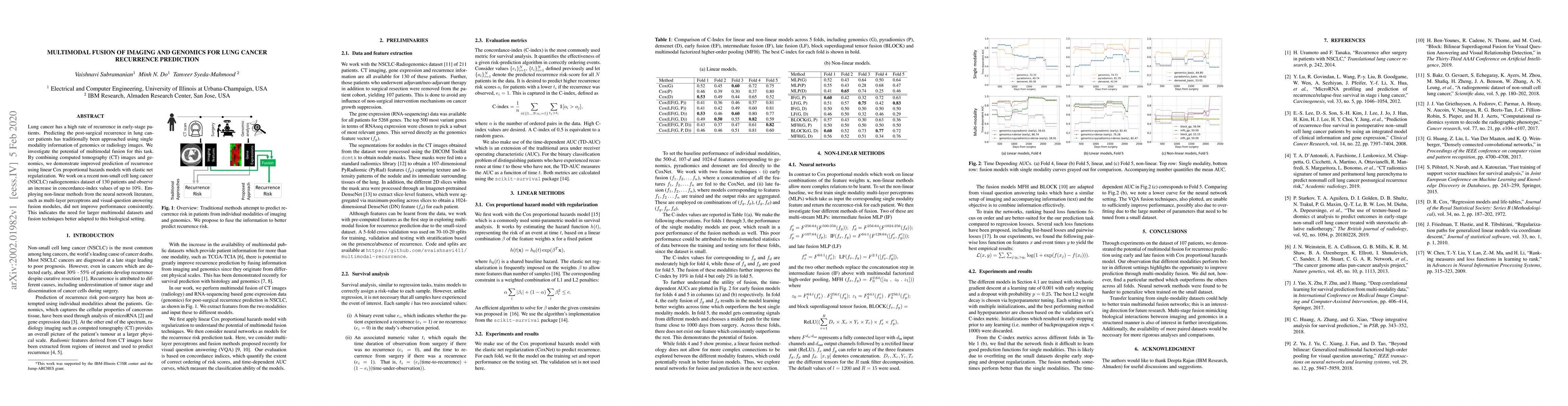 Lung cancer has a high rate of recurrence in early-stage patients. Predicting the post-surgical recurrence in lung cancer patients has traditionally been approached using single modality information of genomics or radiology images. We investigate the potential of multimodal fusion for this task. By combining computed tomography (CT) images and genomics, we demonstrate improved prediction of recurrence using linear Cox proportional hazards models with elastic net regularization. We work on a recent non-small cell lung cancer (NSCLC) radiogenomics dataset of 130 patients and observe an increase in concordance-index values of up to 10%. Employing non-linear methods from the neural network literature, such as multi-layer perceptrons and visual-question answering fusion modules, did not improve performance consistently. This indicates the need for larger multimodal datasets and fusion techniques better adapted to this biological setting.