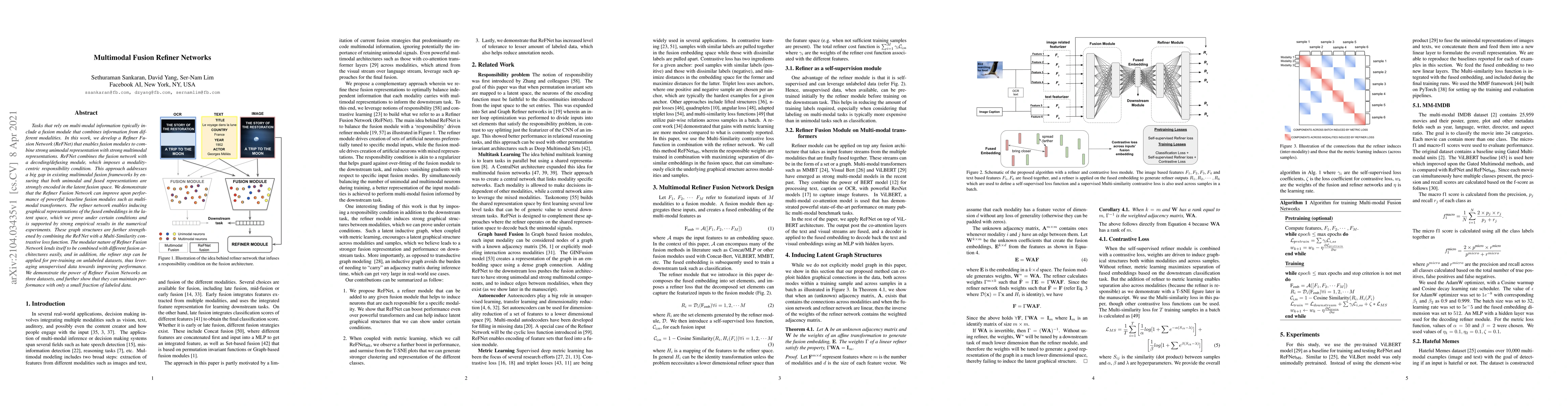 Tasks that rely on multi-modal information typically include a fusion module that combines information from different modalities. In this work, we develop a Refiner Fusion Network (ReFNet) that enables fusion modules to combine strong unimodal representation with strong multimodal representations. ReFNet combines the fusion network with a decoding/defusing module, which imposes a modality-centric responsibility condition. This approach addresses a big gap in existing multimodal fusion frameworks by ensuring that both unimodal and fused representations are strongly encoded in the latent fusion space. We demonstrate that the Refiner Fusion Network can improve upon performance of powerful baseline fusion modules such as multimodal transformers. The refiner network enables inducing graphical representations of the fused embeddings in the latent space, which we prove under certain conditions and is supported by strong empirical results in the numerical experiments. These graph structures are further strengthened by combining the ReFNet with a Multi-Similarity contrastive loss function. The modular nature of Refiner Fusion Network lends itself to be combined with different fusion architectures easily, and in addition, the refiner step can be applied for pre-training on unlabeled datasets, thus leveraging unsupervised data towards improving performance. We demonstrate the power of Refiner Fusion Networks on three datasets, and further show that they can maintain performance with only a small fraction of labeled data.