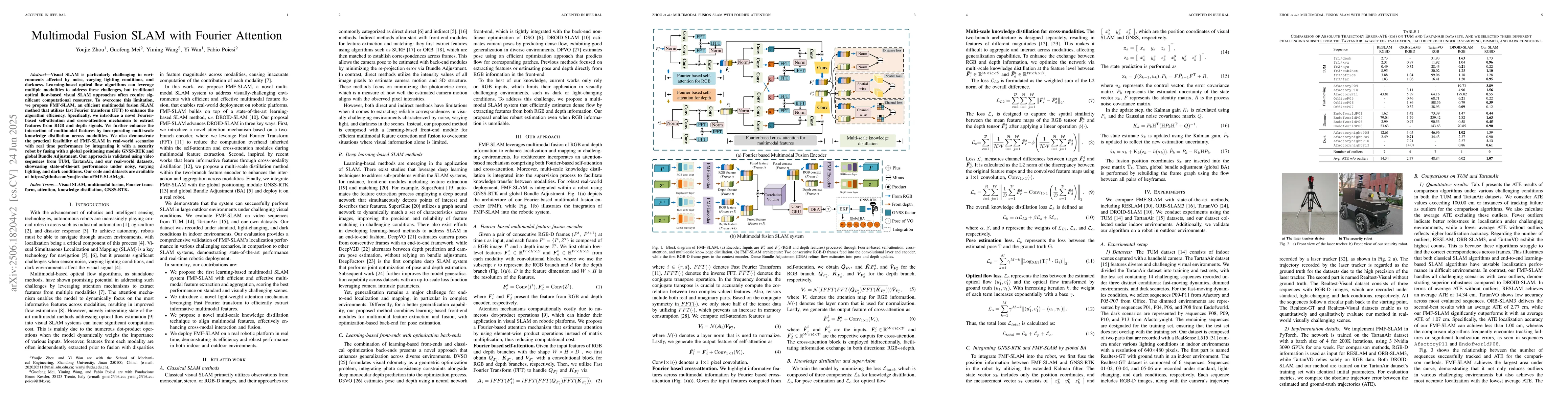 The research introduces FMF-SLAM, an efficient multimodal fusion Simultaneous Localization and Mapping (SLAM) method. It utilizes Fourier-based self-attention and cross-attention mechanisms on RGB and depth signals, enhancing feature extraction. FMF-SLAM also incorporates multi-scale knowledge distillation for improved multimodal feature interaction, demonstrating real-time performance in challenging conditions with a security robot, outperforming existing methods in noisy, varying light, and dark environments.