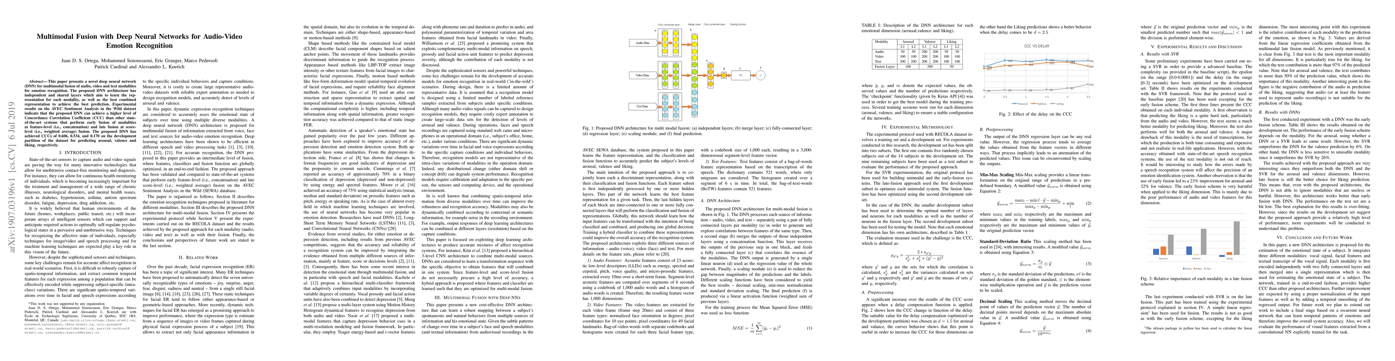 This paper introduces a deep neural network for fusing audio, video, and text modalities to recognize emotions, achieving better Concordance Correlation Coefficient (CCC) than existing fusion methods on the AVEC dataset, demonstrating the effectiveness of independent and shared layers in the proposed architecture.
