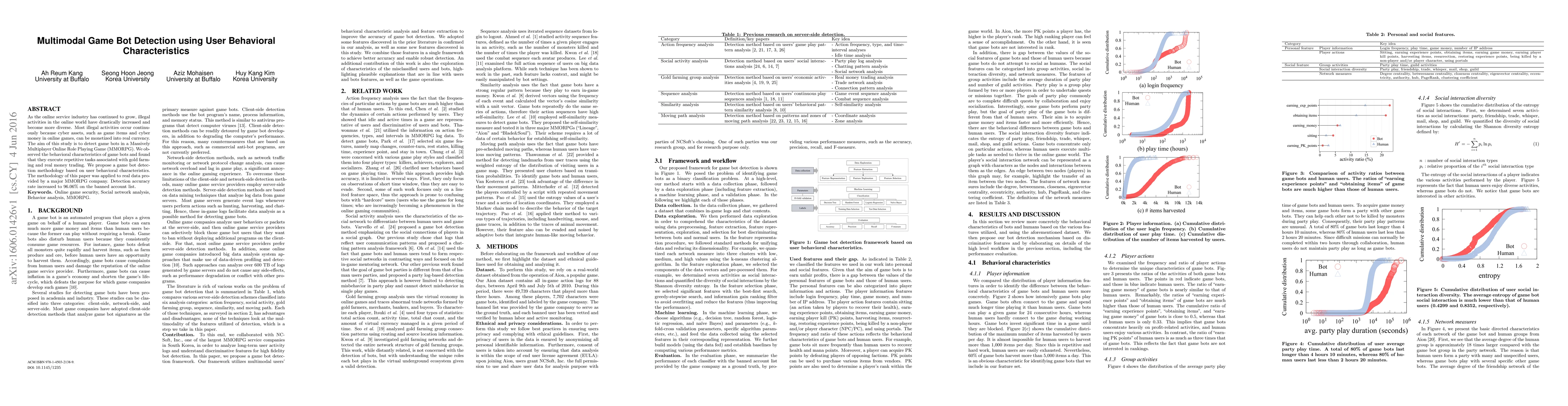 This study proposes a game bot detection methodology using user behavioral characteristics in MMORPGs, achieving a 96.06% accuracy rate on banned accounts. The research focuses on identifying repetitive tasks like gold farming and real money trading executed by game bots.