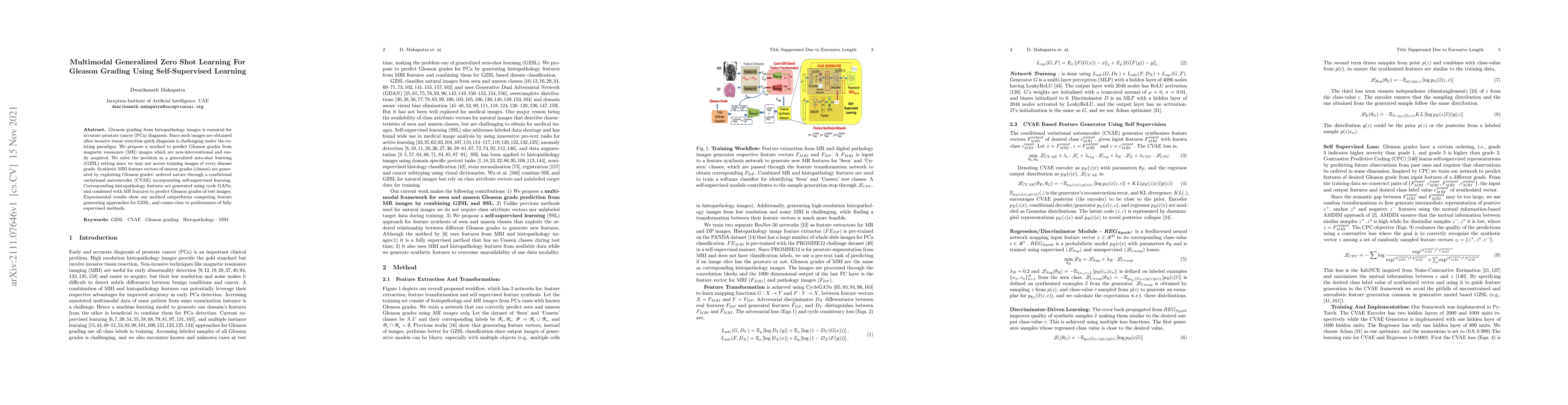 This paper proposes a multimodal generalized zero-shot learning method for Gleason grading using self-supervised learning to predict grades from non-invasive MR images. It leverages synthetic MRI features and histopathology features generated via CVAE and cycle GANs, respectively, to achieve competitive performance against fully supervised methods.