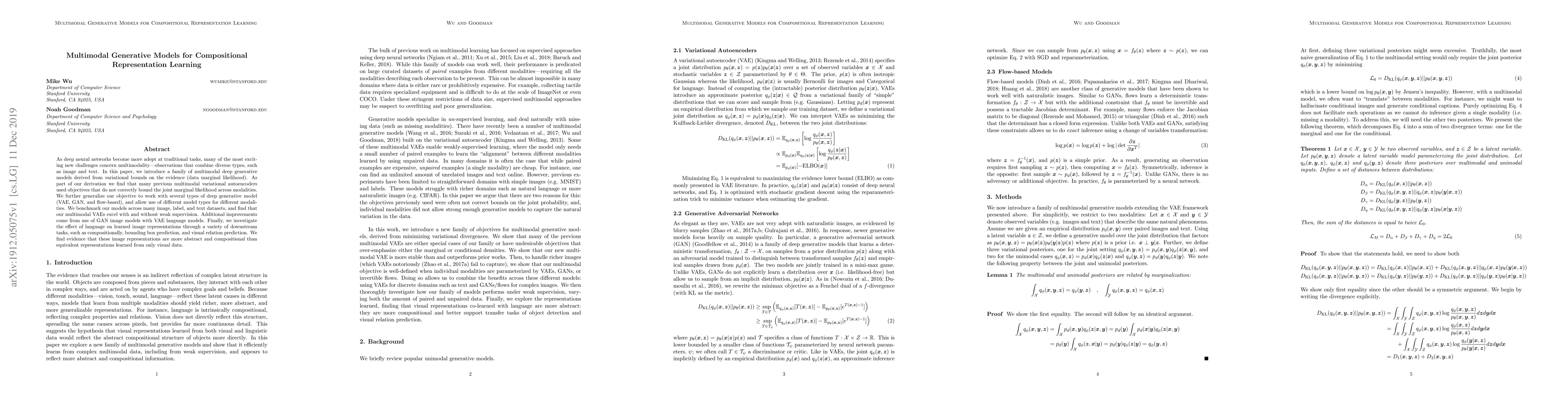 As deep neural networks become more adept at traditional tasks, many of the most exciting new challenges concern multimodality---observations that combine diverse types, such as image and text. In this paper, we introduce a family of multimodal deep generative models derived from variational bounds on the evidence (data marginal likelihood). As part of our derivation we find that many previous multimodal variational autoencoders used objectives that do not correctly bound the joint marginal likelihood across modalities. We further generalize our objective to work with several types of deep generative model (VAE, GAN, and flow-based), and allow use of different model types for different modalities. We benchmark our models across many image, label, and text datasets, and find that our multimodal VAEs excel with and without weak supervision. Additional improvements come from use of GAN image models with VAE language models. Finally, we investigate the effect of language on learned image representations through a variety of downstream tasks, such as compositionally, bounding box prediction, and visual relation prediction. We find evidence that these image representations are more abstract and compositional than equivalent representations learned from only visual data.