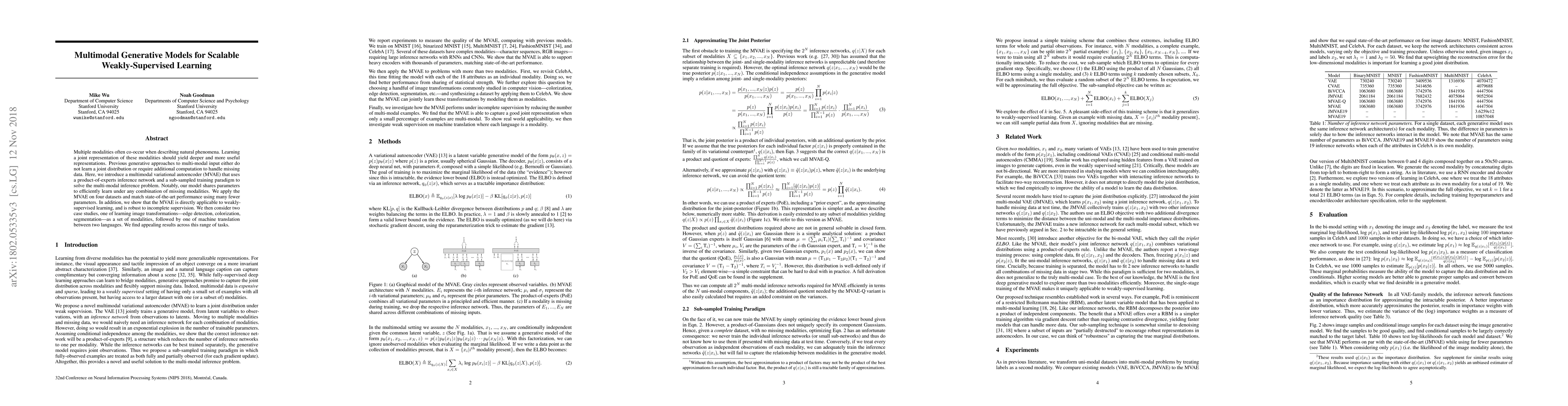 Multiple modalities often co-occur when describing natural phenomena. Learning a joint representation of these modalities should yield deeper and more useful representations. Previous generative approaches to multi-modal input either do not learn a joint distribution or require additional computation to handle missing data. Here, we introduce a multimodal variational autoencoder (MVAE) that uses a product-of-experts inference network and a sub-sampled training paradigm to solve the multi-modal inference problem. Notably, our model shares parameters to efficiently learn under any combination of missing modalities. We apply the MVAE on four datasets and match state-of-the-art performance using many fewer parameters. In addition, we show that the MVAE is directly applicable to weakly-supervised learning, and is robust to incomplete supervision. We then consider two case studies, one of learning image transformations---edge detection, colorization, segmentation---as a set of modalities, followed by one of machine translation between two languages. We find appealing results across this range of tasks.