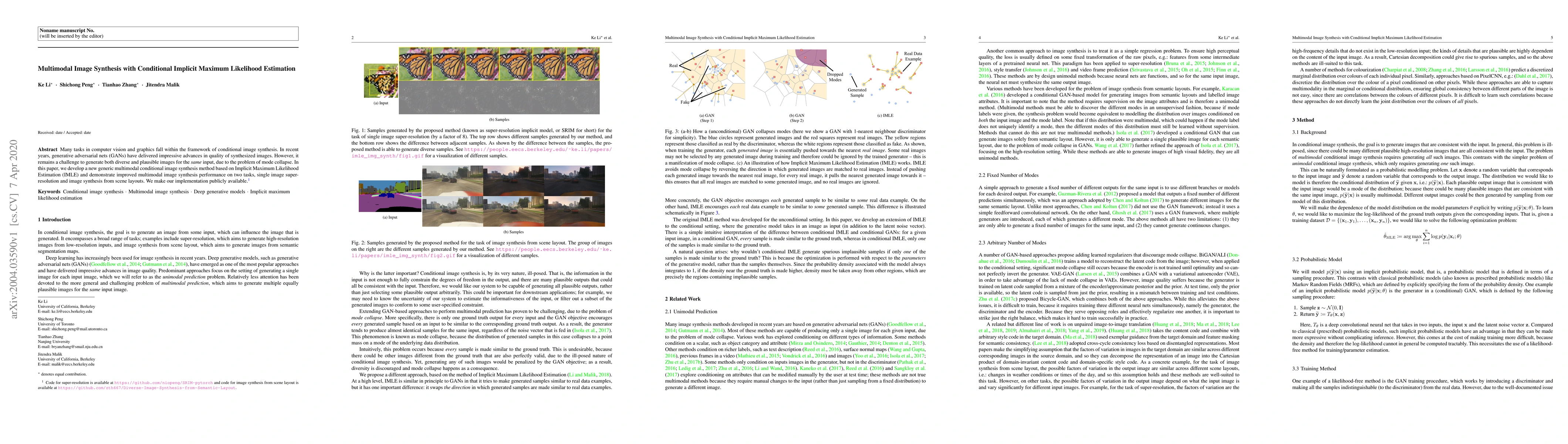 This paper introduces a new method for multimodal conditional image synthesis using Implicit Maximum Likelihood Estimation (IMLE) to address mode collapse in GANs, achieving better results in single image super-resolution and scene layout-based image synthesis. The authors make their implementation publicly available.