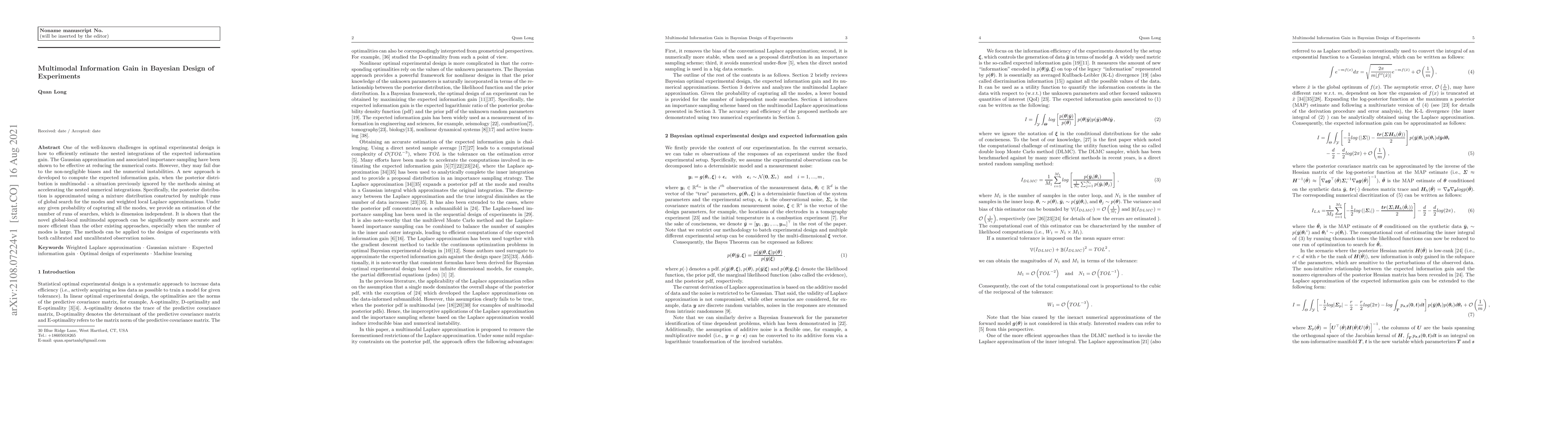 One of the well-known challenges in optimal experimental design is how to efficiently estimate the nested integrations of the expected information gain. The Gaussian approximation and associated importance sampling have been shown to be effective at reducing the numerical costs. However, they may fail due to the non-negligible biases and the numerical instabilities. A new approach is developed to compute the expected information gain, when the posterior distribution is multimodal - a situation previously ignored by the methods aiming at accelerating the nested numerical integrations. Specifically, the posterior distribution is approximated using a mixture distribution constructed by multiple runs of global search for the modes and weighted local Laplace approximations. Under any given probability of capturing all the modes, we provide an estimation of the number of runs of searches, which is dimension independent. It is shown that the novel global-local multimodal approach can be significantly more accurate and more efficient than the other existing approaches, especially when the number of modes is large. The methods can be applied to the designs of experiments with both calibrated and uncalibrated observation noises.