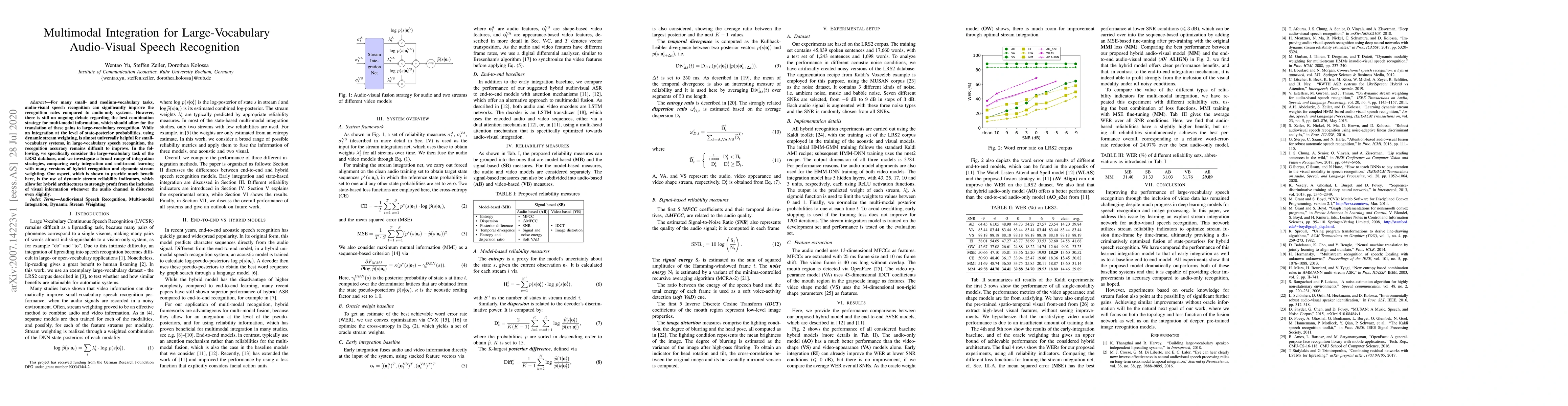 This paper investigates multimodal integration strategies for large-vocabulary audio-visual speech recognition, focusing on the LRS2 database. It finds that dynamic stream weighting and reliability indicators greatly enhance recognition accuracy, especially in noisy conditions, outperforming traditional methods.