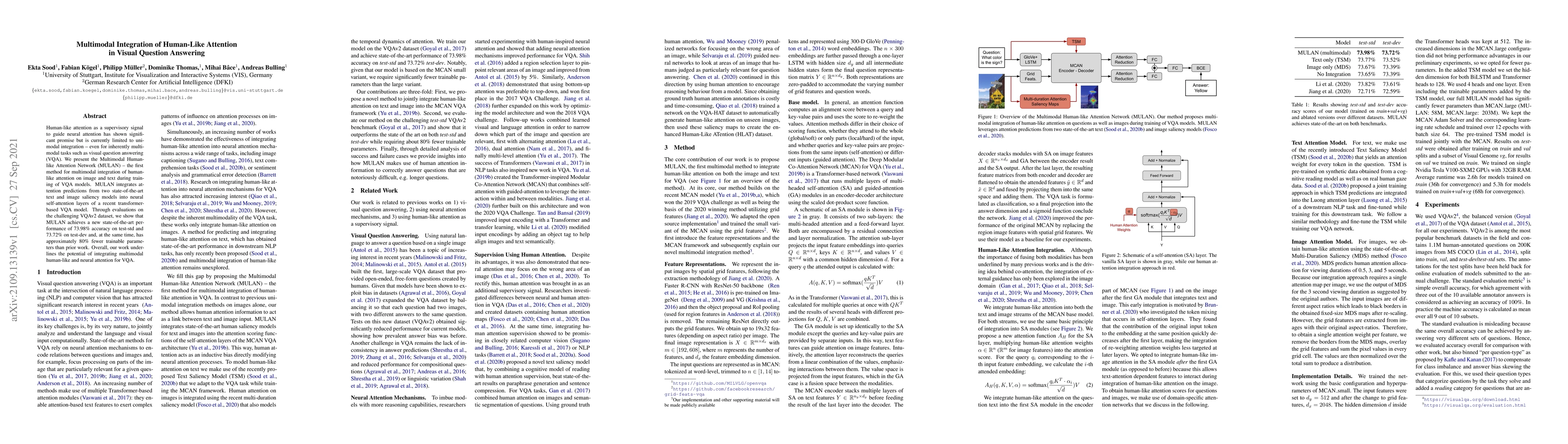 This paper introduces MULAN, a novel method for multimodal integration of human-like attention in visual question answering (VQA), combining text and image saliency models with neural self-attention layers. The approach achieves state-of-the-art performance on the VQAv2 dataset with significantly fewer trainable parameters.