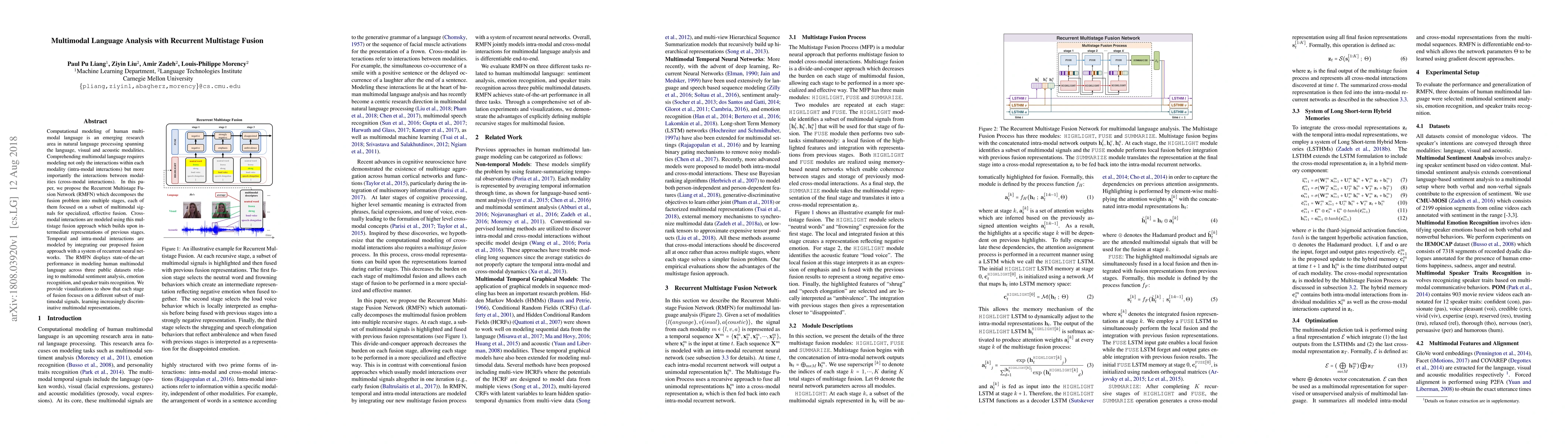 This paper introduces the Recurrent Multistage Fusion Network (RMFN) to model human multimodal language by decomposing fusion into specialized stages, focusing on both cross-modal and intra-modal interactions. The RMFN achieves state-of-the-art performance across datasets for multimodal sentiment analysis, emotion recognition, and speaker traits recognition.