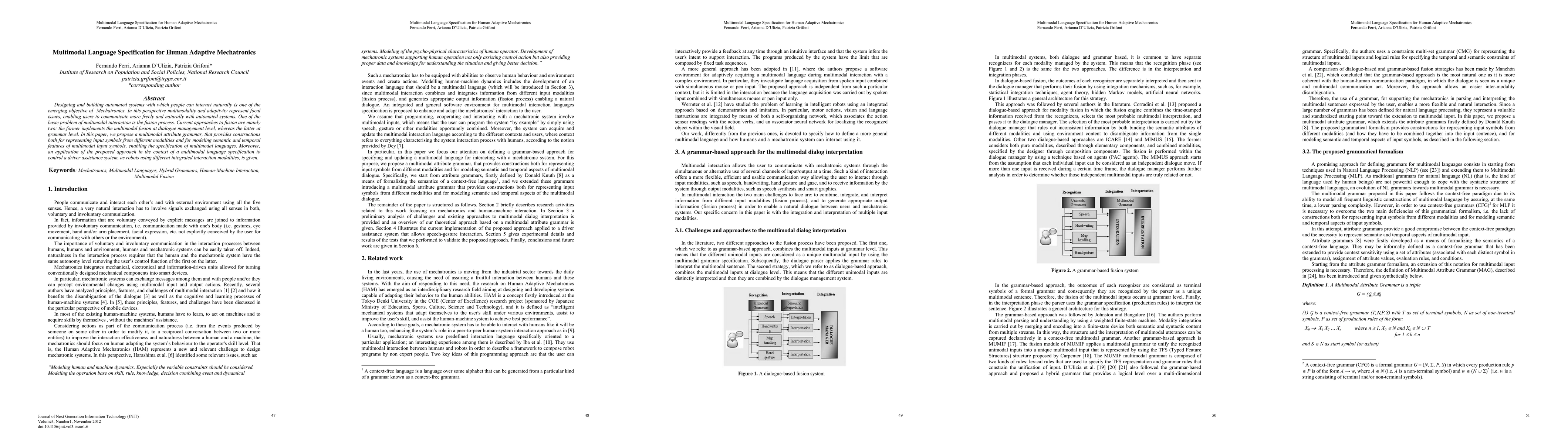 Designing and building automated systems with which people can interact naturally is one of the emerging objective of Mechatronics. In this perspective multimodality and adaptivity represent focal issues, enabling users to communicate more freely and naturally with automated systems. One of the basic problem of multimodal interaction is the fusion process. Current approaches to fusion are mainly two: the former implements the multimodal fusion at dialogue management level, whereas the latter at grammar level. In this paper, we propose a multimodal attribute grammar, that provides constructions both for representing input symbols from different modalities and for modeling semantic and temporal features of multimodal input symbols, enabling the specification of multimodal languages. Moreover, an application of the proposed approach in the context of a multimodal language specification to control a driver assistance system, as robots using different integrated interaction modalities, is given.