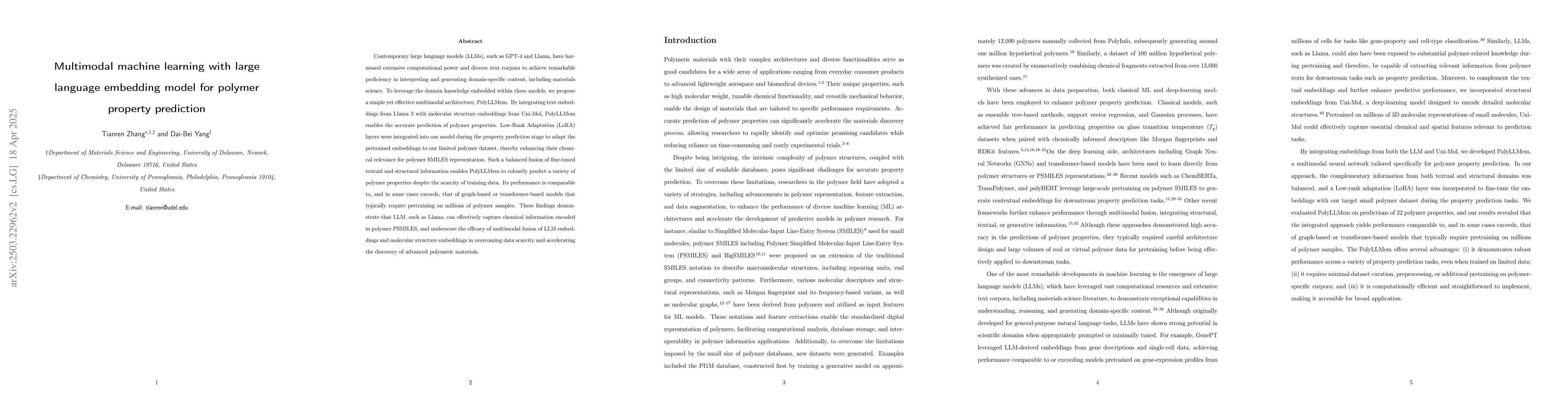 This research demonstrates the efficacy of multimodal fusion of large language model (LLM) embeddings and molecular structure embeddings in overcoming data scarcity and accelerating the discovery of advanced polymeric materials.