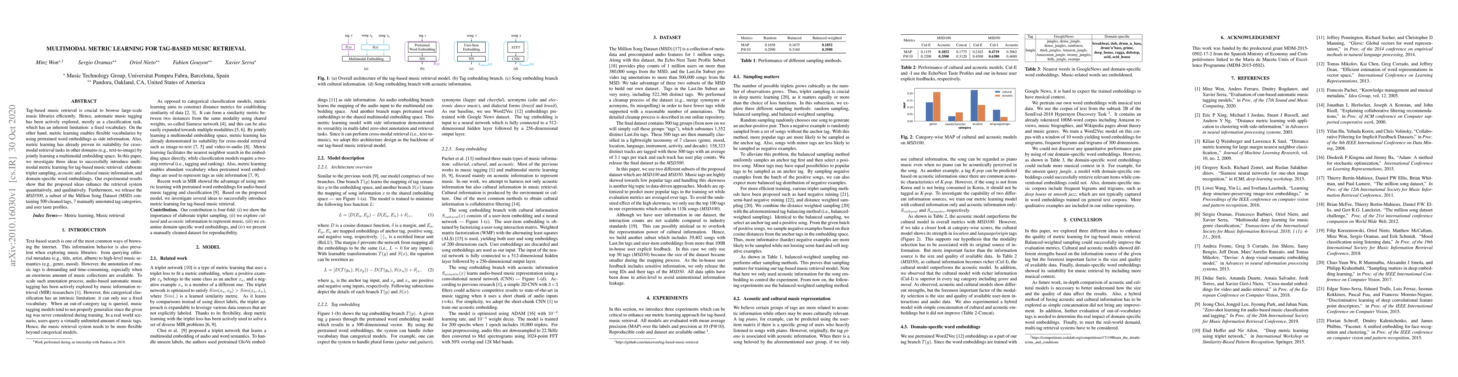 This paper proposes a multimodal metric learning approach for tag-based music retrieval, employing triplet sampling, acoustic and cultural information, and domain-specific word embeddings to improve retrieval flexibility. The study demonstrates enhanced quantitative and qualitative retrieval performance and releases the MSD500 dataset for further research.