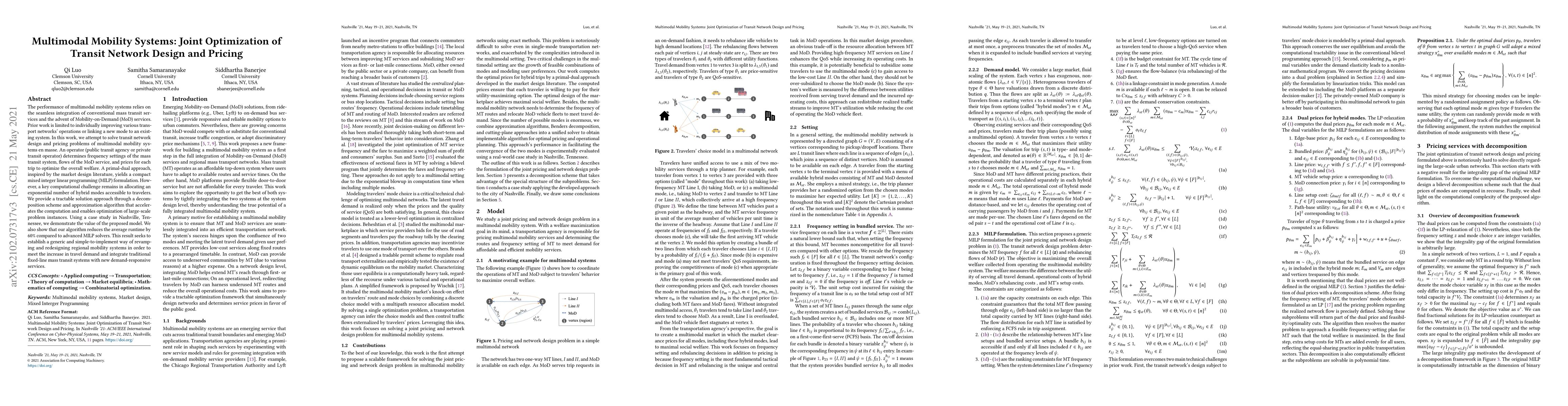 This paper proposes a joint optimization framework for designing and pricing multimodal mobility systems, integrating both conventional mass transit and Mobility-on-Demand services. The authors use a primal-dual approach to develop a mixed integer linear programming model, addressing the computational challenge of hybrid mode allocation with a decomposition scheme and approximation algorithm, which reduces runtime by 60% in a Nashville case study.