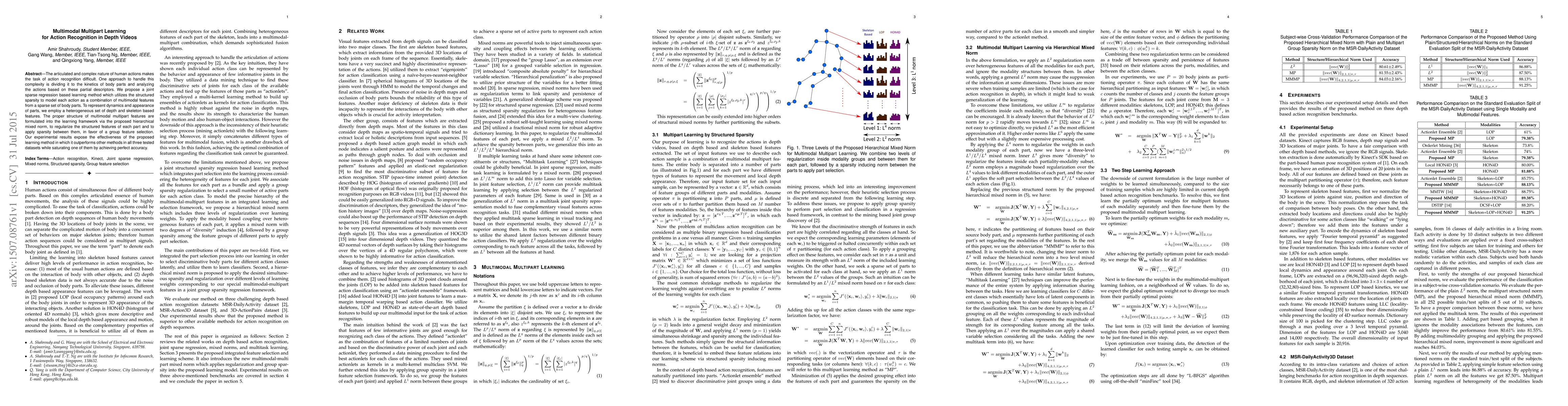 The articulated and complex nature of human actions makes the task of action recognition difficult. One approach to handle this complexity is dividing it to the kinetics of body parts and analyzing the actions based on these partial descriptors. We propose a joint sparse regression based learning method which utilizes the structured sparsity to model each action as a combination of multimodal features from a sparse set of body parts. To represent dynamics and appearance of parts, we employ a heterogeneous set of depth and skeleton based features. The proper structure of multimodal multipart features are formulated into the learning framework via the proposed hierarchical mixed norm, to regularize the structured features of each part and to apply sparsity between them, in favor of a group feature selection. Our experimental results expose the effectiveness of the proposed learning method in which it outperforms other methods in all three tested datasets while saturating one of them by achieving perfect accuracy.