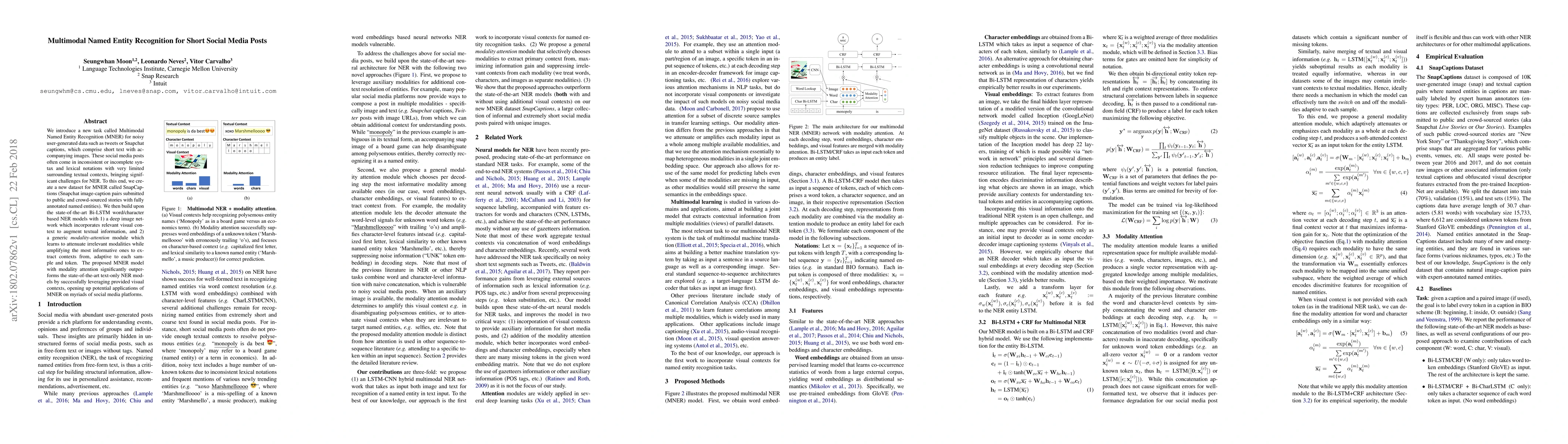 This paper introduces Multimodal Named Entity Recognition (MNER) for short social media posts, addressing challenges in noisy, context-limited text with accompanying images. The authors propose a new dataset, SnapCaptions, and enhance Bi-LSTM NER models with a deep image network and a modality-attention module, achieving superior performance over text-only NER models.