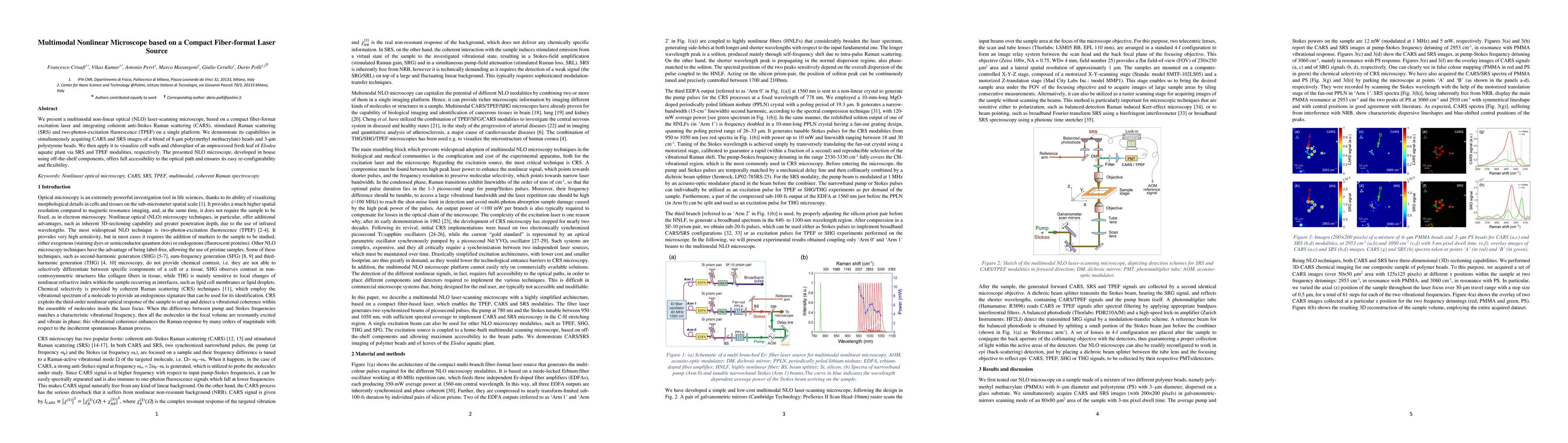 We present a multimodal non-linear optical (NLO) laser-scanning microscope, based on a compact fiber-format excitation laser and integrating coherent anti-Stokes Raman scattering (CARS), stimulated Raman scattering (SRS) and two-photon-excitation fluorescence (TPEF) on a single platform. We demonstrate its capabilities in simultaneously acquiring CARS and SRS images of a blend of 6-{\mu}m poly(methyl methacrylate) beads and 3-{\mu}m polystyrene beads. We then apply it to visualize cell walls and chloroplast of an unprocessed fresh leaf of Elodea aquatic plant via SRS and TPEF modalities, respectively. The presented NLO microscope, developed in house using off-the-shelf components, offers full accessibility to the optical path and ensures its easy re-configurability and flexibility.