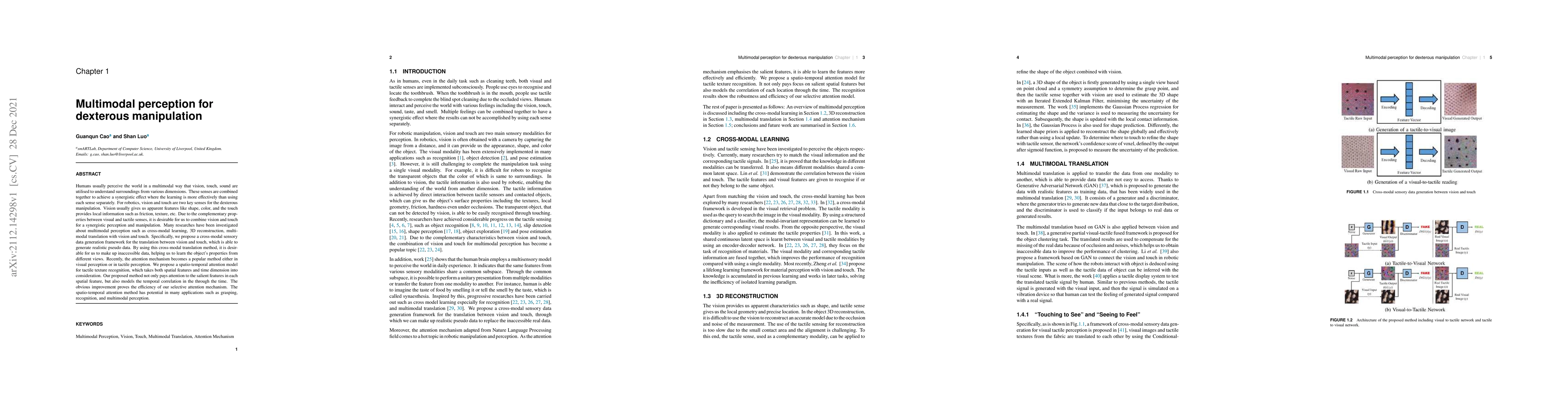 This paper explores multimodal perception for dexterous manipulation in robotics, emphasizing the integration of vision and touch. It proposes a cross-modal sensory data generation framework to translate between vision and touch, enhancing the learning of object properties from different perspectives. Additionally, it introduces a spatio-temporal attention model for tactile texture recognition, demonstrating significant improvements in efficiency and potential applications in grasping and recognition.