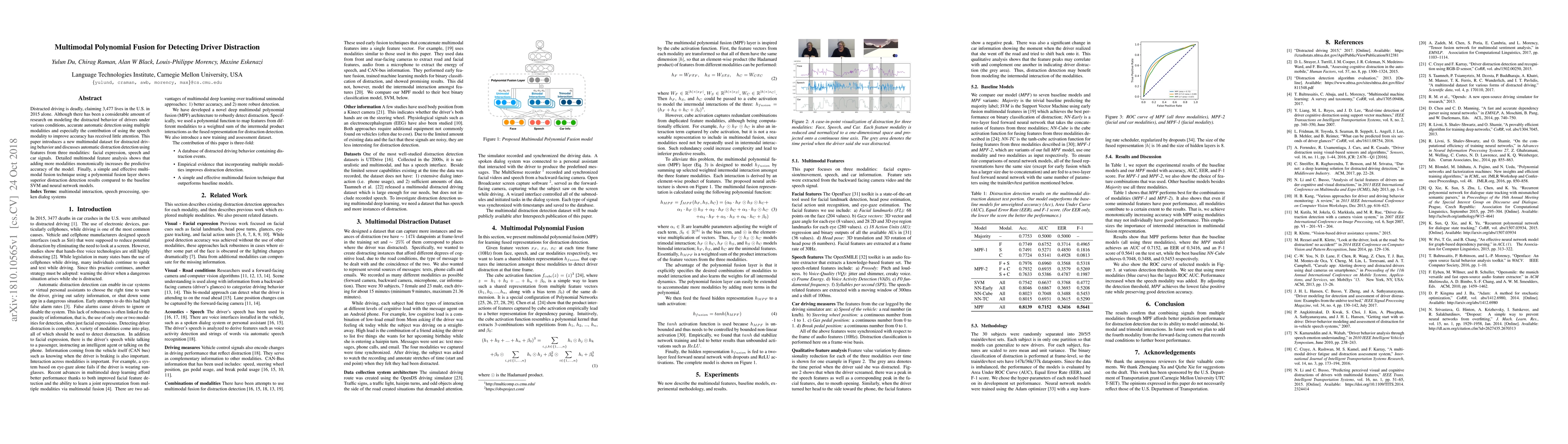 A new multimodal dataset was created to detect distracted driving behavior using facial expression, speech, and car signals. A polynomial fusion layer outperformed baseline models in distraction detection accuracy.