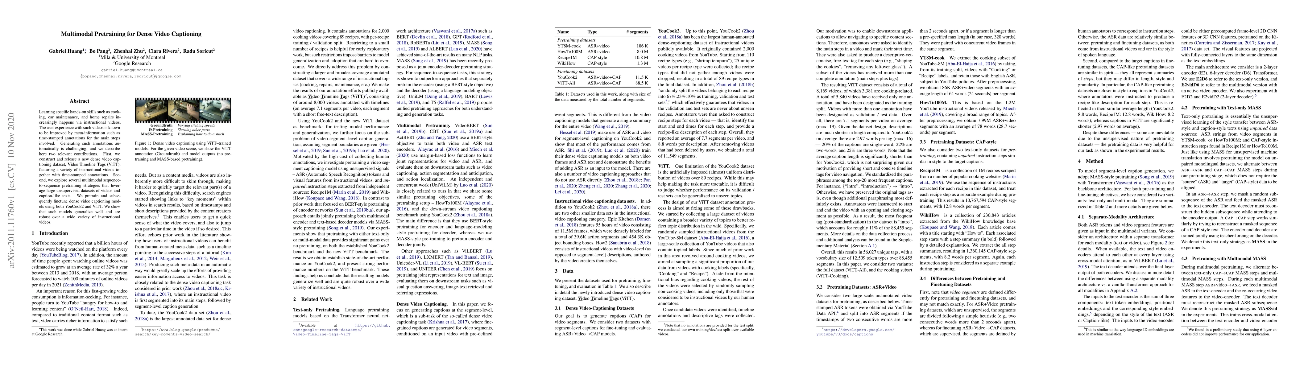 Learning specific hands-on skills such as cooking, car maintenance, and home repairs increasingly happens via instructional videos. The user experience with such videos is known to be improved by meta-information such as time-stamped annotations for the main steps involved. Generating such annotations automatically is challenging, and we describe here two relevant contributions. First, we construct and release a new dense video captioning dataset, Video Timeline Tags (ViTT), featuring a variety of instructional videos together with time-stamped annotations. Second, we explore several multimodal sequence-to-sequence pretraining strategies that leverage large unsupervised datasets of videos and caption-like texts. We pretrain and subsequently finetune dense video captioning models using both YouCook2 and ViTT. We show that such models generalize well and are robust over a wide variety of instructional videos.