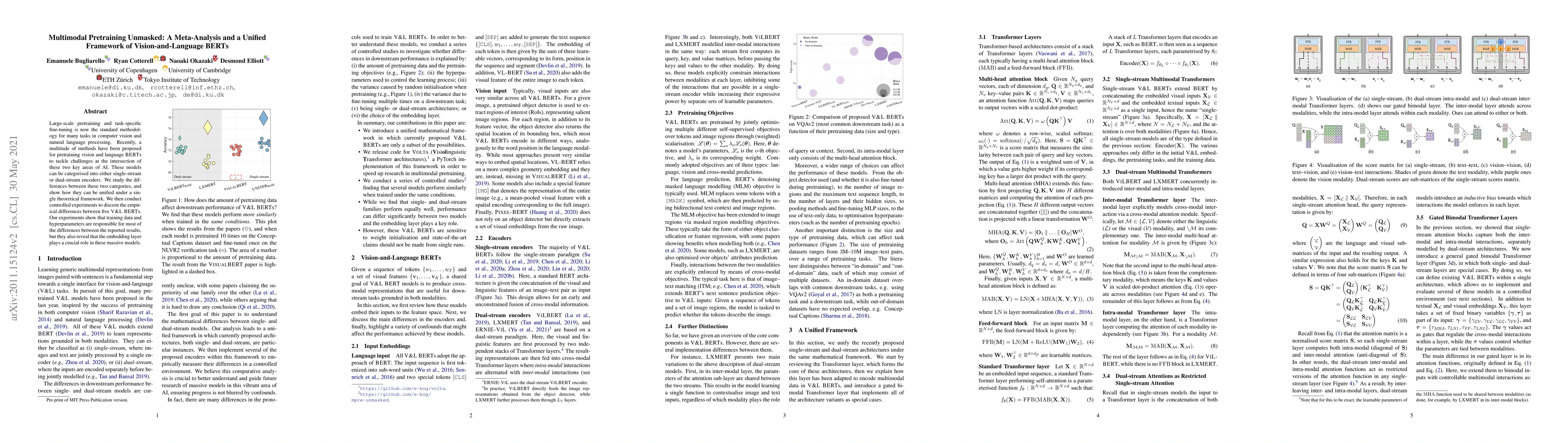 Large-scale pretraining and task-specific fine-tuning is now the standard methodology for many tasks in computer vision and natural language processing. Recently, a multitude of methods have been proposed for pretraining vision and language BERTs to tackle challenges at the intersection of these two key areas of AI. These models can be categorised into either single-stream or dual-stream encoders. We study the differences between these two categories, and show how they can be unified under a single theoretical framework. We then conduct controlled experiments to discern the empirical differences between five V&L BERTs. Our experiments show that training data and hyperparameters are responsible for most of the differences between the reported results, but they also reveal that the embedding layer plays a crucial role in these massive models.